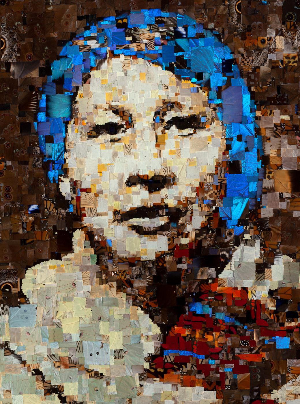 Rita Smith’s hair is pulled back in a coruscating flash of blue morpho and her expression is enigmatic–a velvety black gaze reaching us from a distant moment in time. A folded serape neatly wraps her shoulders, its intriguing surface composed of hundreds of variegated patterned pieces. In the artist Benjamin Timpson’s 2021 rendition of this 1920’s-era black and white portrait, Smith is both ephemeral and radiant with lived humanity. Timpson’s use of deconstructed and intricately overlapped butterfly wings as a medium of portraiture presents his subjects as woven from the complex materials of memory, nature, metamorphosis, and survival.