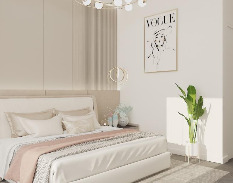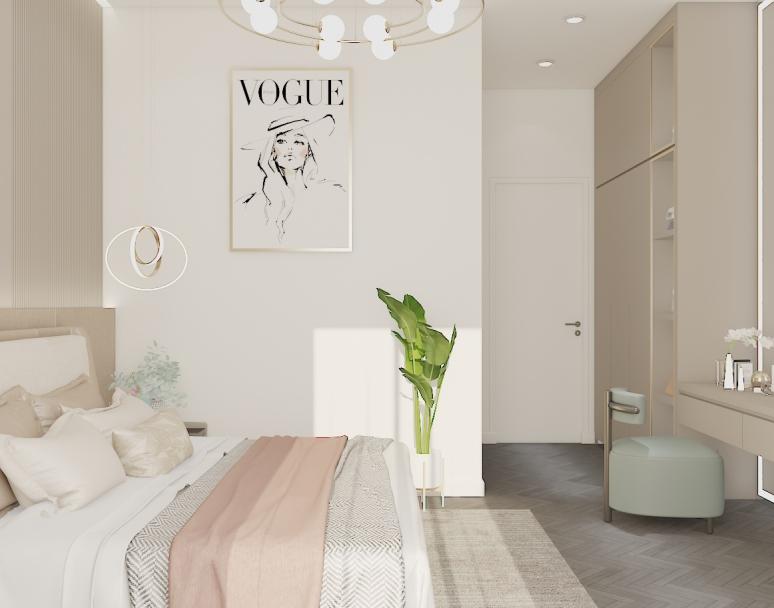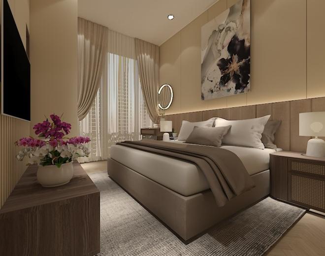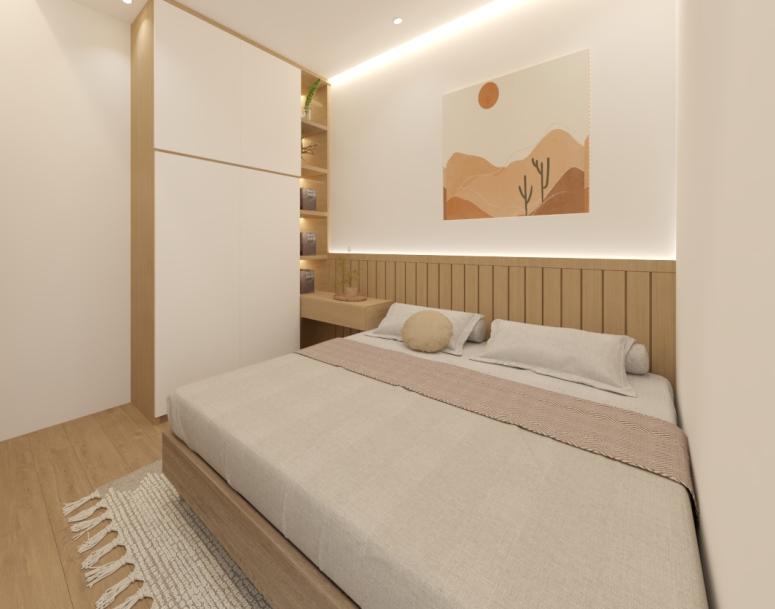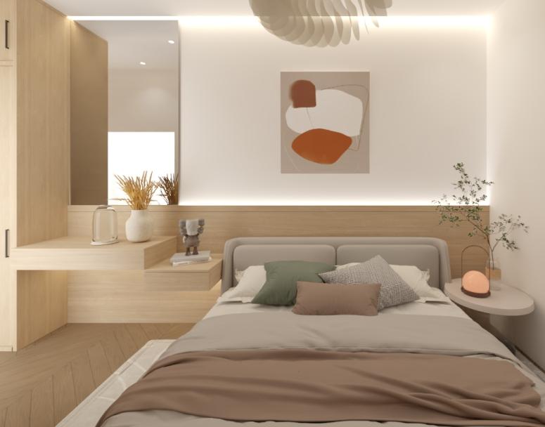 Interior Kamar tidur pada rumah tinggal 2 lantai ini memiliki bertemakan scandinavian dengan perpaduan warna beige dan tekstur kayu yang lembut.