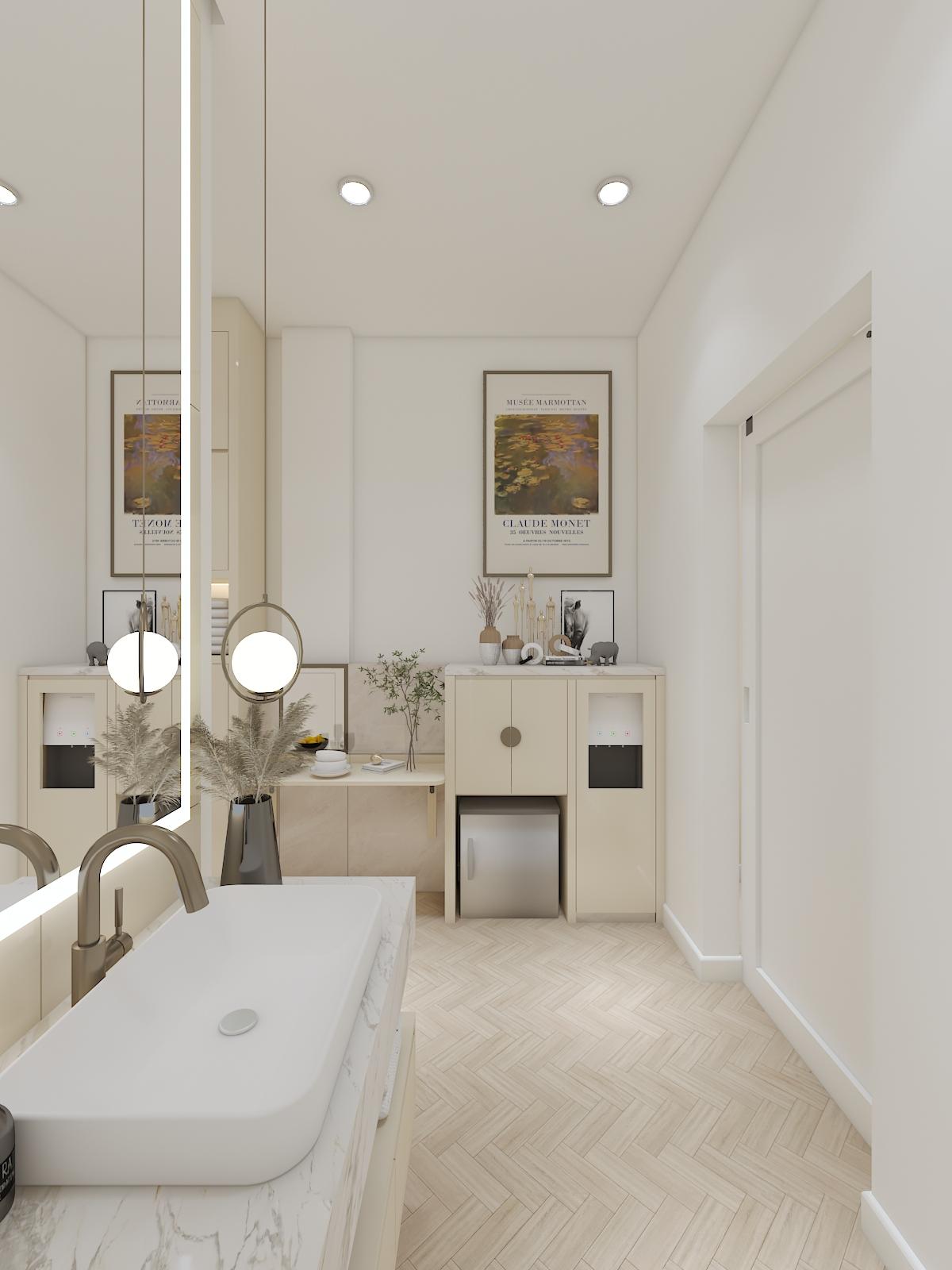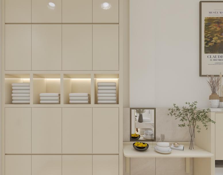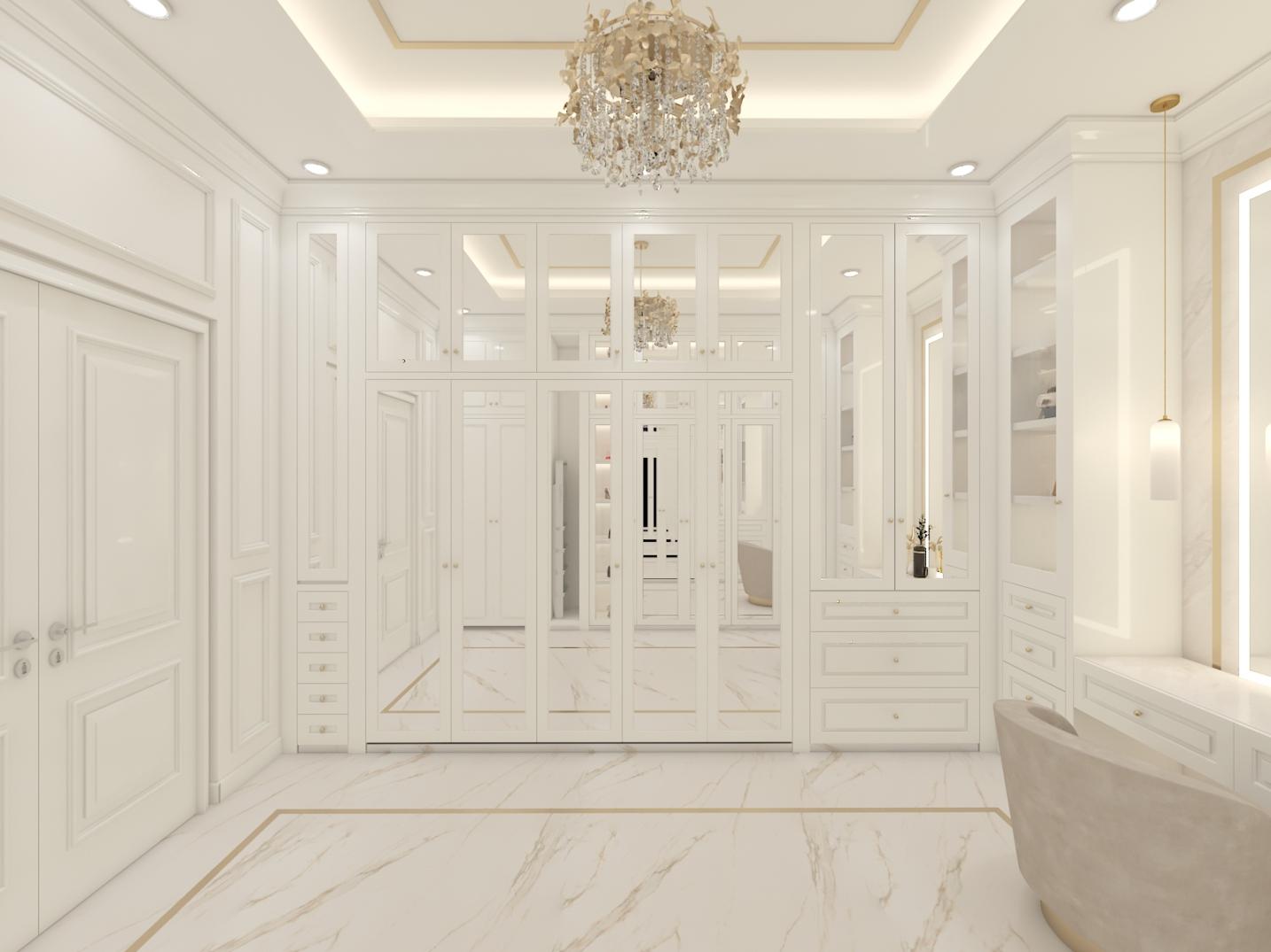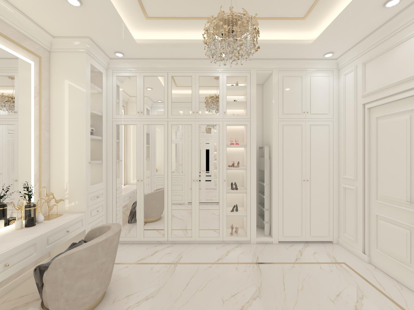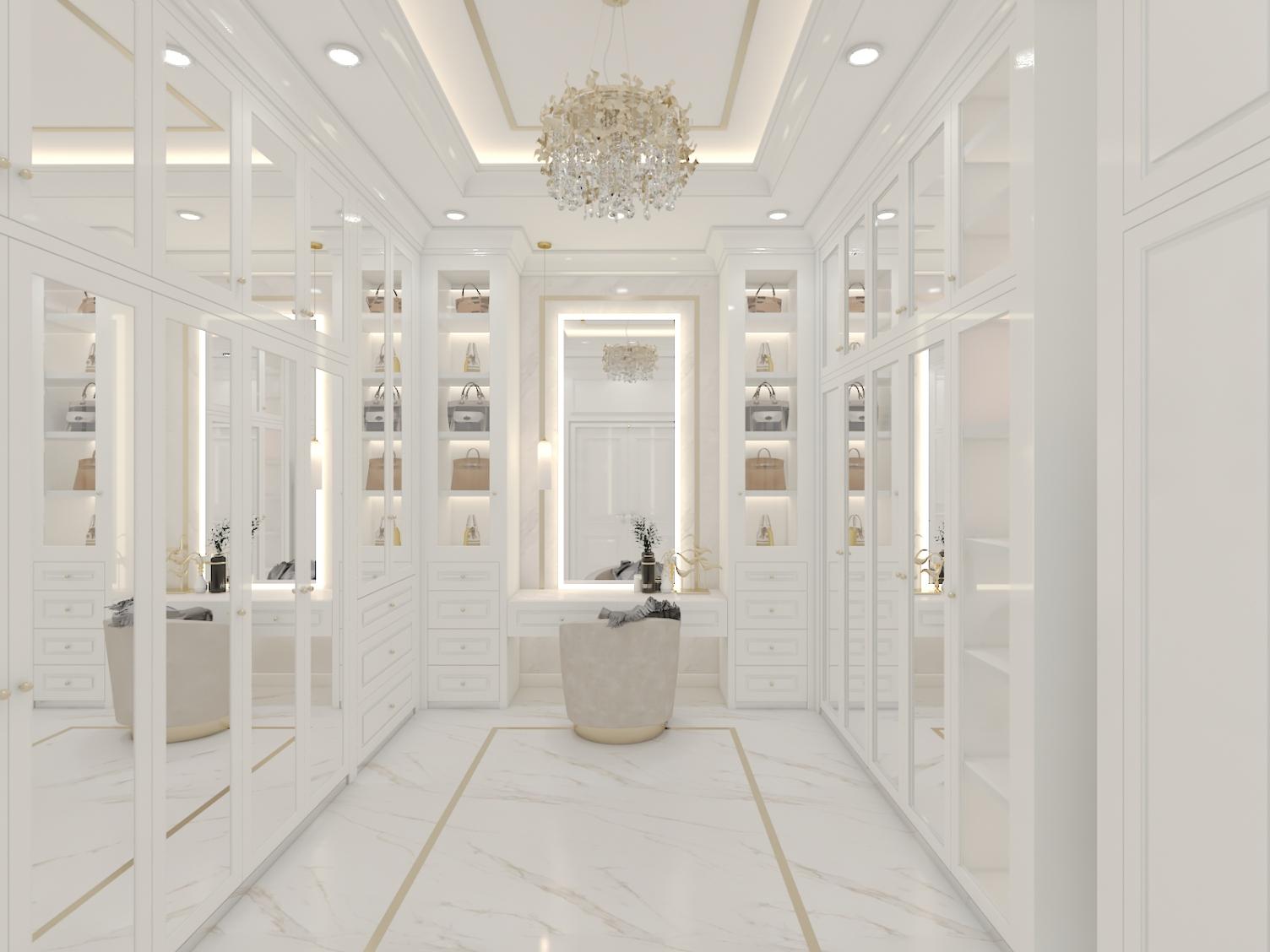 Interior Walking Closet ini ber konsep Neoclassic dengan ukiran simple yang didominasi warna