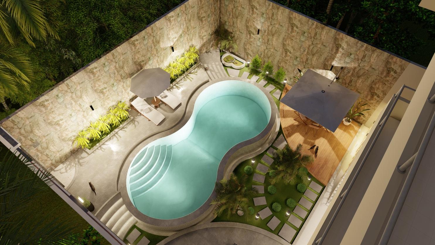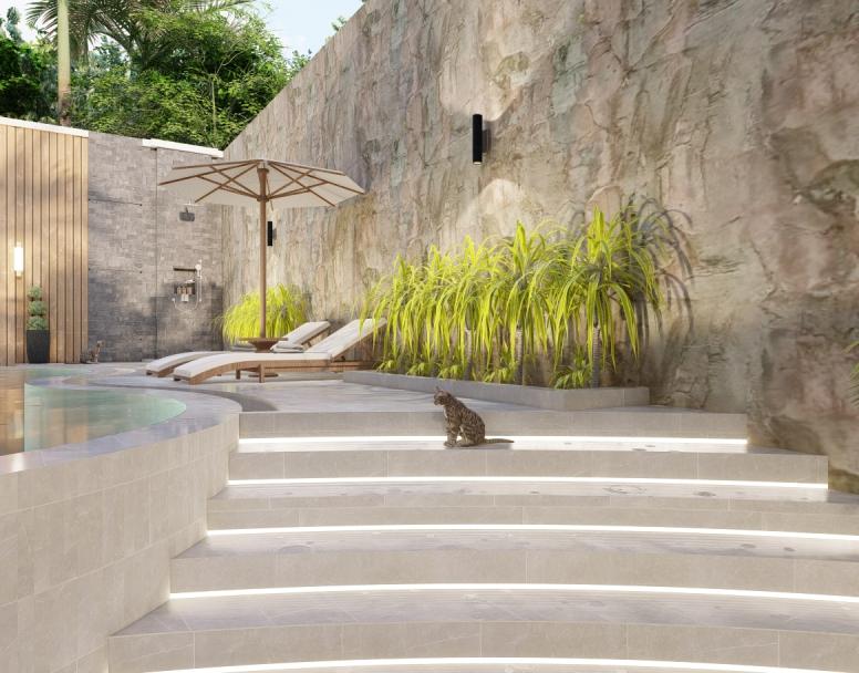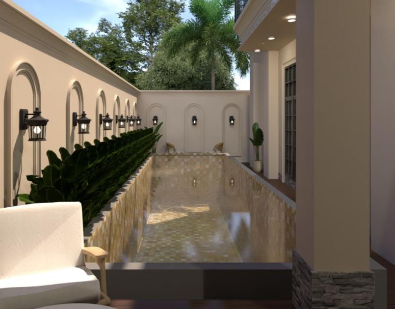 Eksterior kolam renang yang memanfaatkan luas lahan eksisting pada rumah tinggal. Kolam renang ini bertemakan arsitektur tropis dengan perpaduan material batu alam dan aksen kayu.