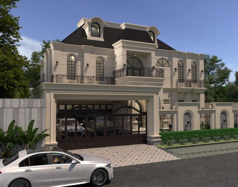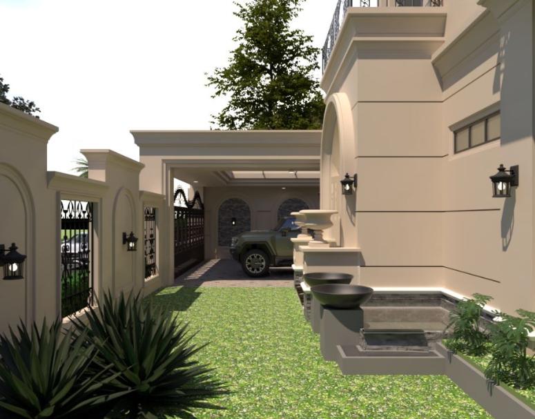 Rumah ini mengusung konsep American Classic yang cenderung lebih sederhana dengan ukiran yang minimalis dengan perpaduan cat dinding beige dan material batu alam serta dengan penataan taman yang luas.