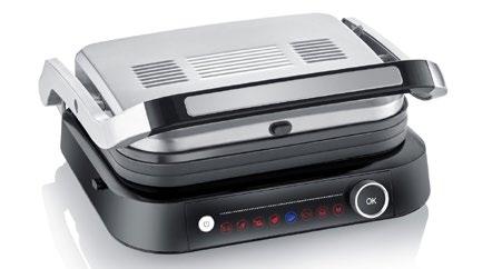 KONTAKTGRILL SEVINI PRO Der Kontaktgrill SEVINI PRO KG 2395 ist ein weiteres kulinarisches Multitalent, das eine gesündere Zubereitung von Speisen ermöglicht. Schmackhafte Panini und Sandwiches oder aber auch Gemüse, Fisch und saftige Steaks lassen sich mit dem neuen Modell ganz einfach auf den Punkt genau grillen. Dafür sorgen intelligente Automatikprogramme und ein Perfect Steak Sensor, der die Dicke des Grillguts automatisch erkennt. Die optimale Hitzeübertragung und -verteilung der direkt in die Grillplatten eingelassenen Heizelemente sorgt für eine appetitliche Bräunung, ohne dass zusätzliches Öl oder Fett benötigt wird. Zudem wird überschüssiges Fett in die entnehmbare Auffangschale abgeleitet. So wird das Grillen zur fettarmen Angelegenheit. Die abnehmbaren Grillplatten machen die anschließende Reinigung zum Kinderspiel. Deren spezielle ILAG Antihaft-Keramikbeschichtung steht für besondere Kratzfestigkeit und garantiert Langlebigkeit auch bei intensiver Nutzung. Mit seinem zeitlosen Design fügt sich der Grill gut in jede Küche ein. Preis: 159,90 Euro