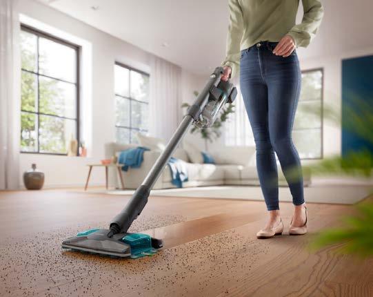Der Philips Akku-Staubsauger 8000 Aqua von Versuni sagt Staub, Schmutz und Flecken den Kampf an – und das an allen Fronten: Mit der Aqua Saug- und Wischdüse saugt und wischt das neue Modell gleichzeitig bei jeder Vorwärtsund Rückwärtsbewegung. Wer ausschließlich saugen möchte, verwendet die PrecisionPower Smart-Düse, die ihre Bürstenrotation und den Luftstrom automatisch für alle Böden, ob hart oder weich, optimiert. Dabei sorgt die PowerCyclone 12 Technologie dafür, dass mehr Staub und Schmutz aufgenommen wird als bei jedem anderen Akku-Staubsauger – bei minimalem Akkuverbrauch. Zudem ist der Akku erstmals austauschbar, wodurch mithilfe eines Wechsels die Laufzeit auf bis zu 160 Minuten im Eco-Modus verlängert werden kann.