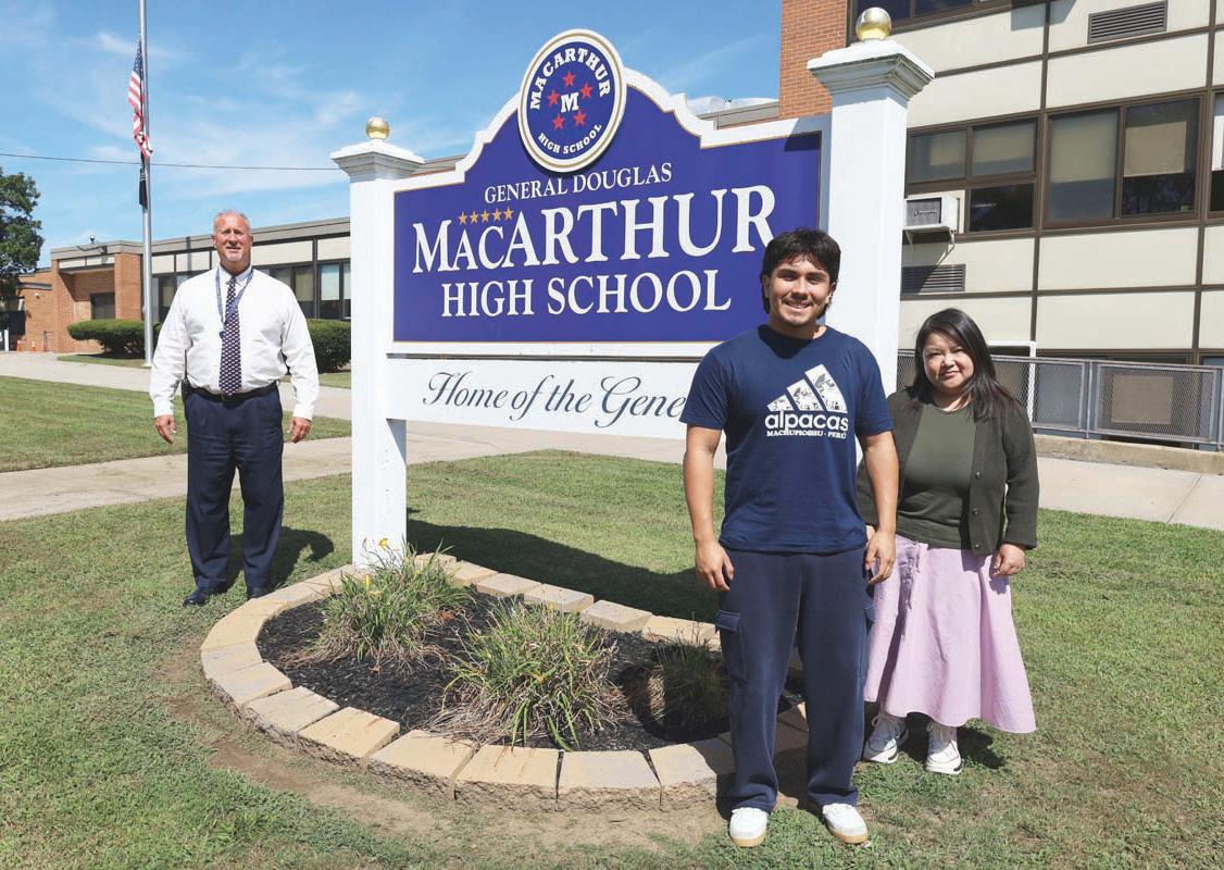 MacArthur senior Benjamin Morales was selected to play violin in the All-State Symphony Orchestra. He is pictured with Principal Joseph Sheehan and Orchestra Director Sha Wu.