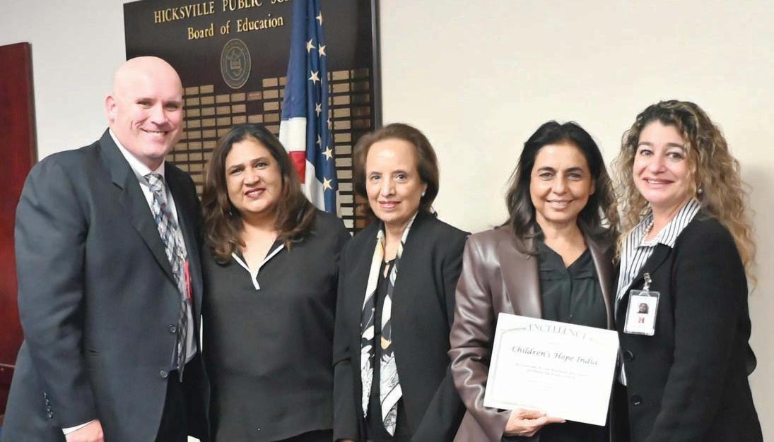 Hicksville Superintendent of Schools Dr. Ted Fulton, Hicksville Board of Education trustee Sunita Manjrekar, Children’s Hope India President Dr. Dina Pahlajani, Children’s Hope India executive board member Moneesha Sani and Hicksville Supervisor of Guidance Services Effie Rafaelides.