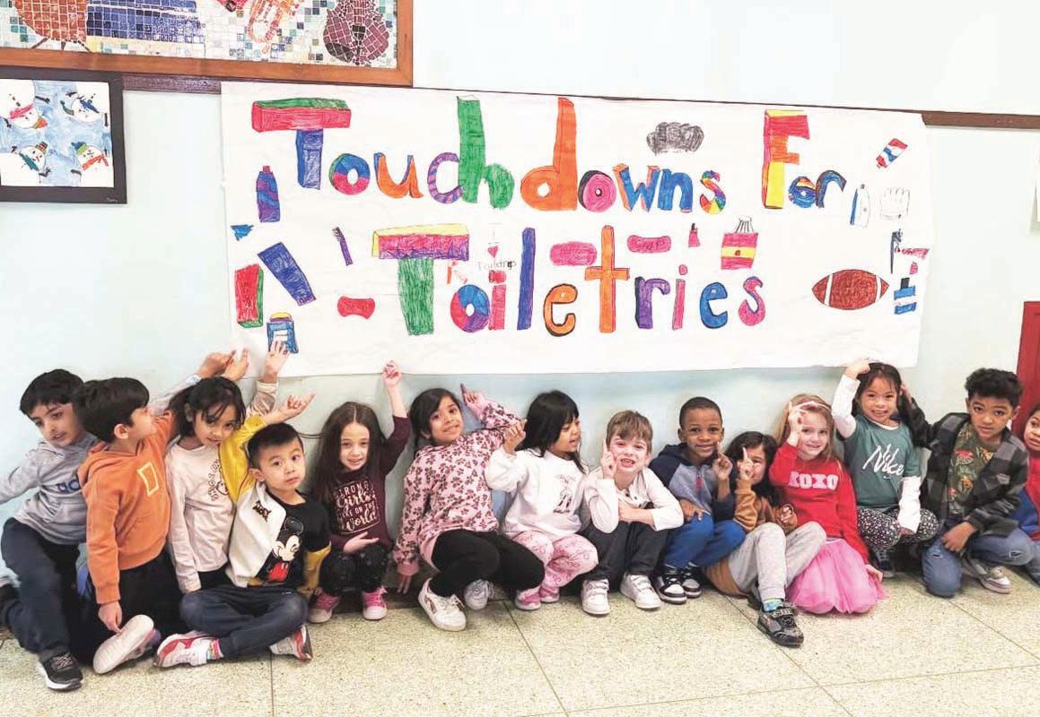 Celebrating the spirit of the 2026 Super Bowl, students at Old Country Road Elementary School in Hicksville are making a difference by collecting toiletries for local individuals in need as part of the student council’s Touchdowns for Toiletries effort. Photo courtesy of Hicksville Public Schools