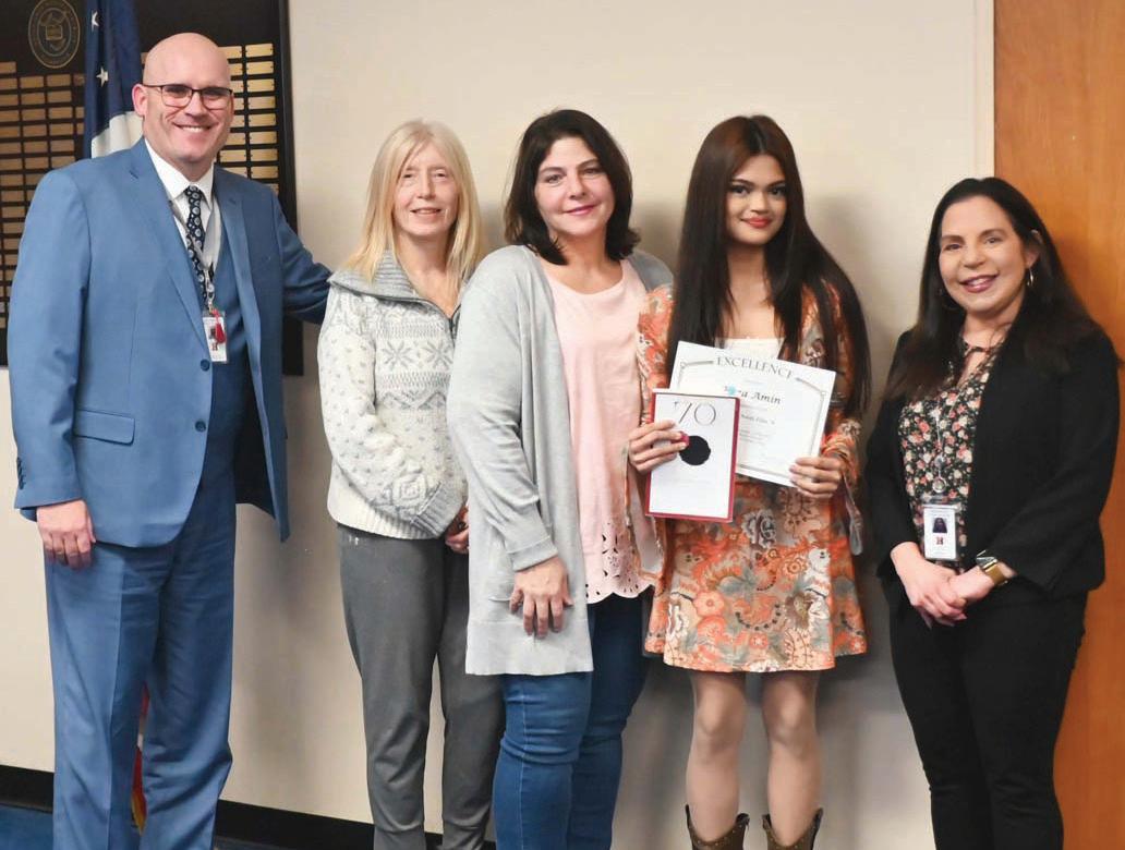 Hicksville Board of Education trustee Danielle Fotopoulos, Hicksville Superintendent of Schools Dr. Ted Fulton, students Angelica Mera, Hannah Mathis, Adiyat Hussain, Shelby Fraser, Nandini Bali, Ava Middleton, Aanya Rawal, ex officio student board member Christina D’Costa, Hicksville Board of Education trustee Patricia Bulerin and Hicksville Supervisor of English, Reading and Libraries Dr. Catherine Carella-Dean. Missing from photo: Raahil Mohammad and Anusha Shah.