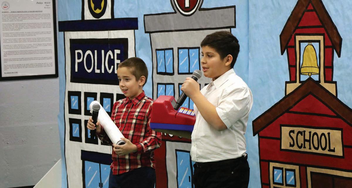 In front of backdrops representing places of work like a library, police department and a hospital, students from all five Levittown elementary schools dressed for the matching job. They discussed the many things they have learned in the Career Exploration program, which introduces Levittown’s youngest learners to a variety of professions, helping spark curiosity and inspire future aspirations. Through direct interaction with professionals from a broad range of careers, as well as engaging lessons that have students take on the role, students gain a clearer understanding of how classroom learning connects to real-world careers. Through a video presentation, trustees and guests saw these lessons in action as students checked a teddy bear with a stethoscope to learn about being a doctor, studied various rocks and minerals as
