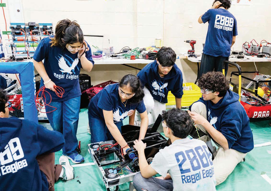 robotics team, the Regal Eagles, work on their robots in the pit area