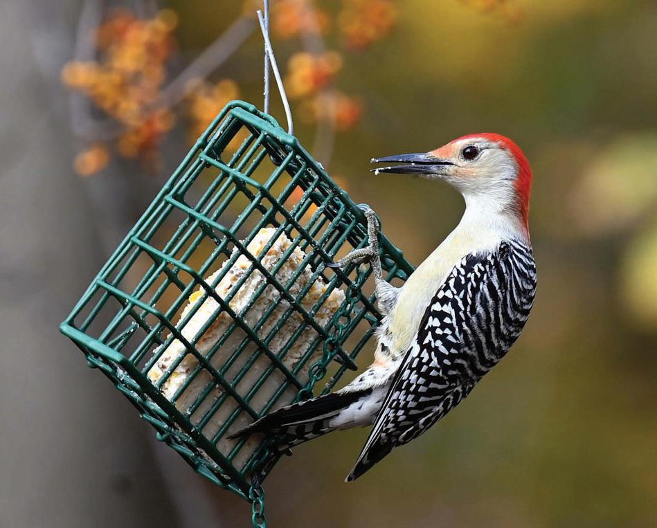 Suet cakes, offered in suet cages, are pure fat energy that is great for insect-eaters and clinging birds like woodpeckers. These days, suet cakes come in a variety of flavors, with added ingredients like peanut, fruit, and insect bits-and-pieces.