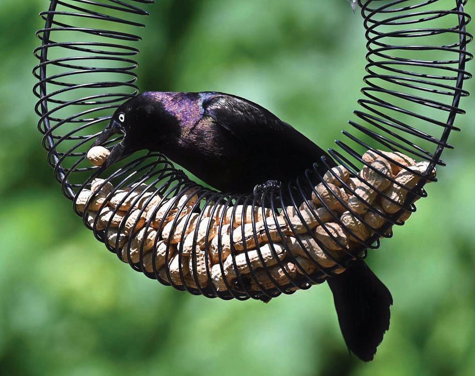 Unsalted whole peanuts are another great choice for birds. The special peanut feeder hanging at the Gardens regularly draws blue Jays,