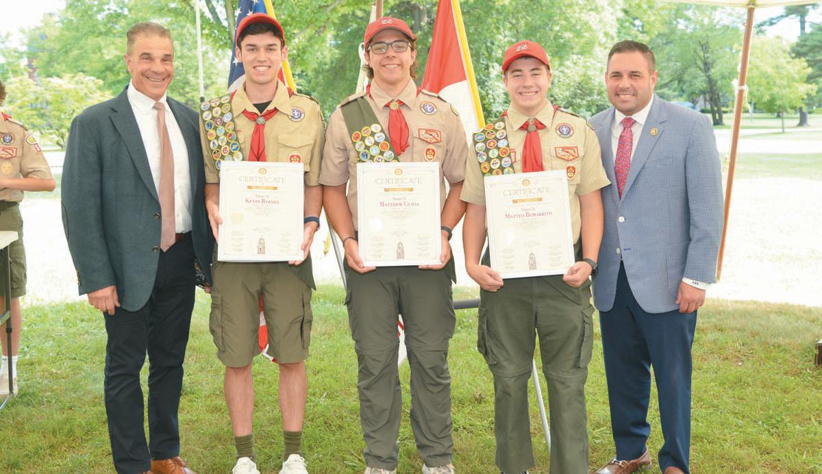 Hempstead Town Councilman Tom Muscarella (left) congratulated Garden City residents Kevin Byrnes, Matthew Guida and Matthew Bommarito as they reached the rank of Eagle Scout. The Court of Honor was held on June 8, at the Cathedral of the Incarnation in Garden City. Also attending was Congressman Anthony D’Esposito.