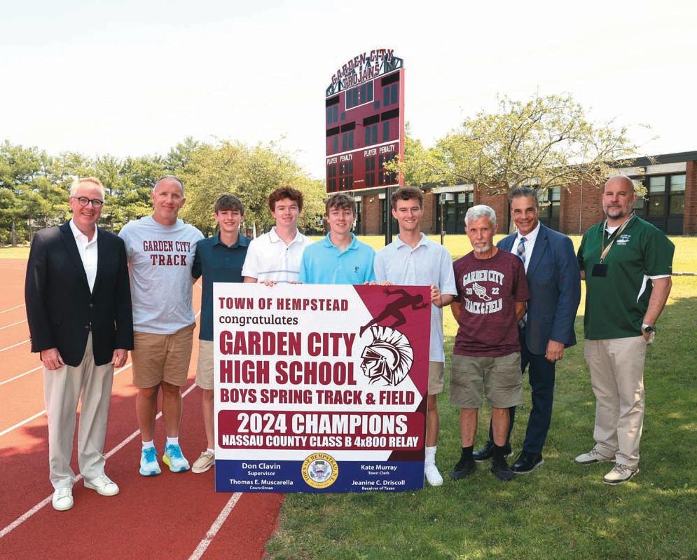 Hempstead Town Supervisor Don Clavin (left) and Councilman Tom Muscarella (second right) presented a commemorative sign to members of the Garden City High School Boys Spring Track & Field team in recognition of them winning the Nassau County Class B 4x800 Relay 2024 Championship. Also attending were coaches Brian McDonald and George Dreher, and Athletic Director Ed Ramirez.