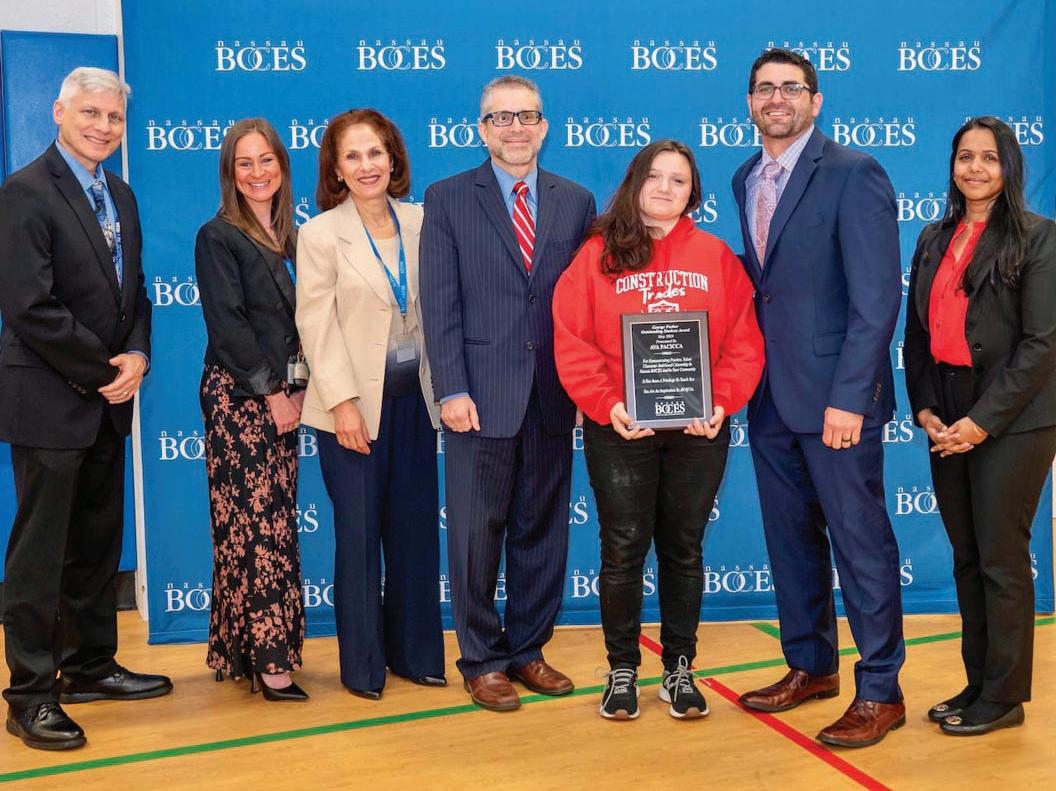 Ava Pacicca of Syosset, who attends Nassau BOCES Barry Tech, is congratulated on earning the George Farber Outstanding Student Award by Nassau BOCES Board President Susan Bergtraum (third from left), Deputy Superintendent/Chief Operating Officer James Widmer (left), and a host of administrators, teachers, friends and family at the recent award ceremony.