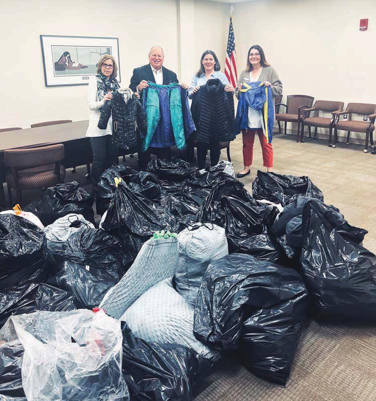 In its first week, the annual coat drive hosted by Nassau County Legislator Arnold W. Drucker (DPlainview) has already netted dozens of donations for the Long Island Coalition for the Homeless. Pictured above on Wednesday, Nov. 23, Legislator Drucker and officials at the Syosset Public Library display some of the donations that have already come in.