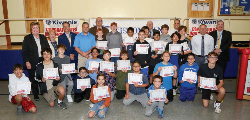 Khindri (Grade 7), Michael McCarthy (Grade 7), Nicholas Mingacci (Grade 7), Lucas Reyes (Grade 7), Roger Polanco (Grade 7), Matthew Porcasi (Grade 7), Sujit Ravi (Grade 7), Saim Rehman (Grade 7), Lucas Reyes (Grade 7), Dylan James Tira (Grade 7), Christopher Williams (Grade 7) and David Yoo (Grade 7) during the Terrific Kids Ceremony on November 2, 2022 at Wisdom Lane Middle School in Levittown. Also attending were Levittown Kiwanis members Michael Papas and Jim and Pat Carney; Wisdom Lane Middle School Principal John Avena and Assistant Principal Craig Arve lo-Shaw; and Levittown Superintendent of Schools Todd Winch.