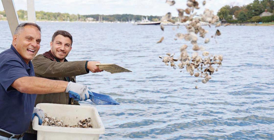 Town Supervisor Joseph Saladino and Councilman Lou Imbroto help to add a half million oyster and clam seedlings to Shellfish Sanctuaries in Oyster Bay Harbor.