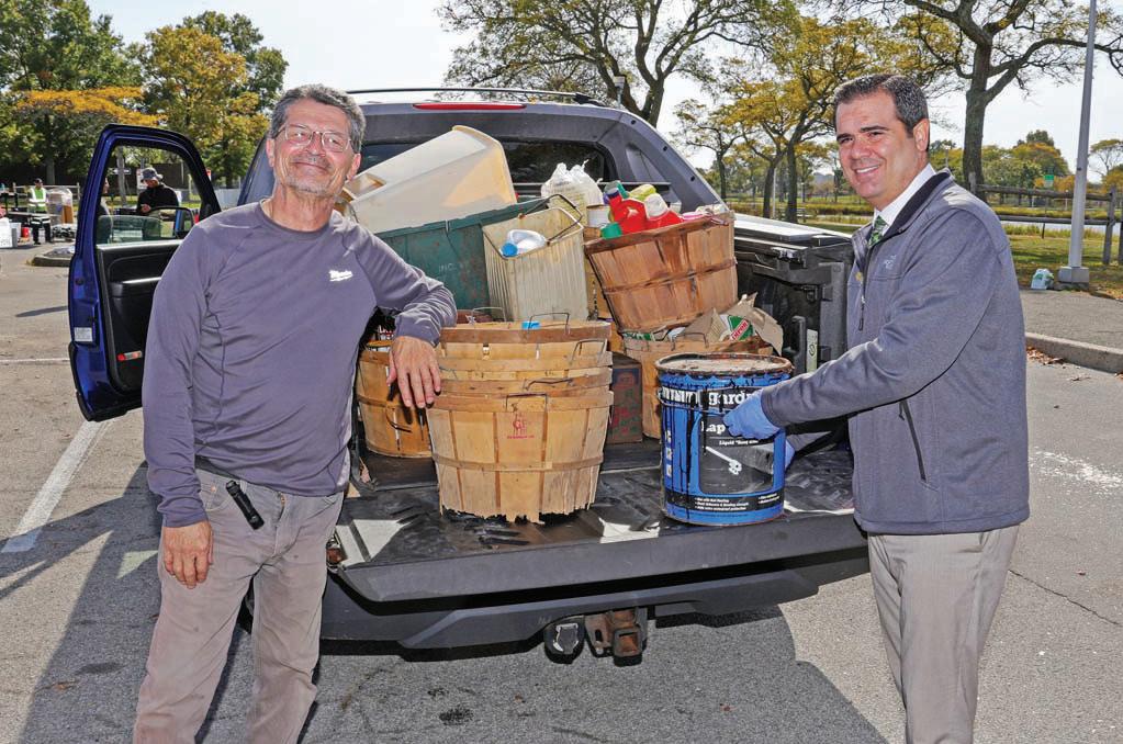 Hempstead Town Supervisor John Ferretti (right) assisted Silvio Bronco of Floral Park as he participated in the Town of Hempstead Stop Throwing Out Pollutants (S.T.O.P.) Program on October 19, 2025 at North Woodmere Park. This program allows residents to dispose of harmful pollutants – such as antifreeze, drain cleaners and pesticides – in a safe and environmentally friendly manner.