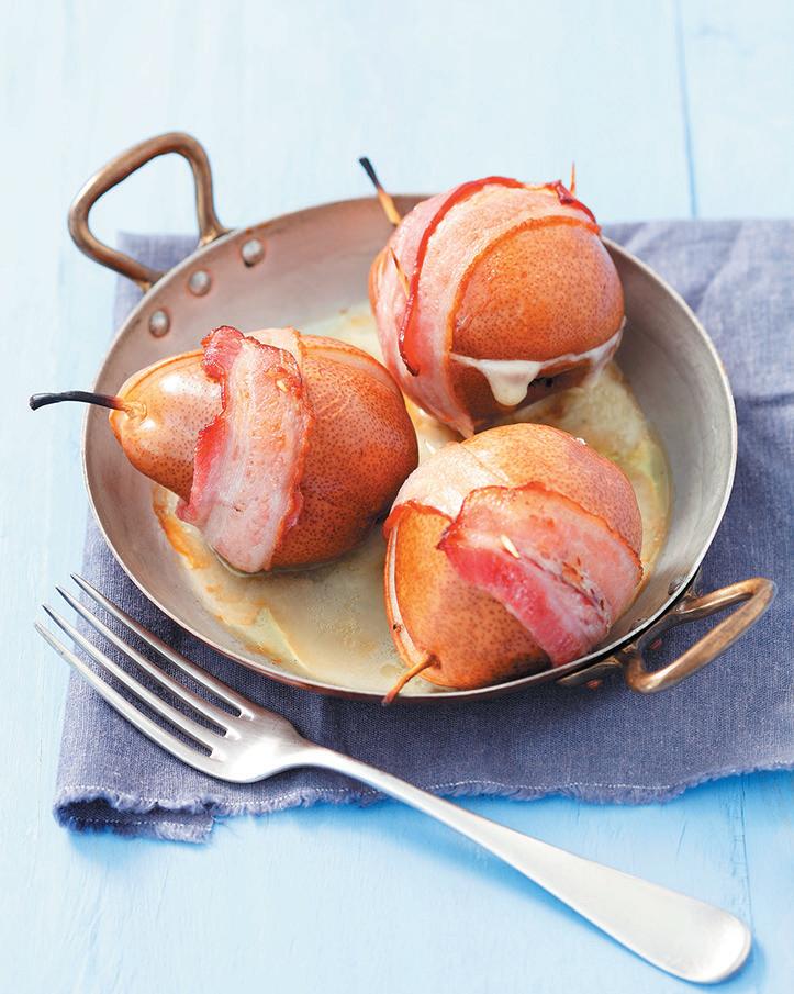 of bacon. Place the pears in a baking dish and top with the butter. Drizzle with the honey and bake for around 20 minutes until golden brown. Baste occasionally with the melted butter.