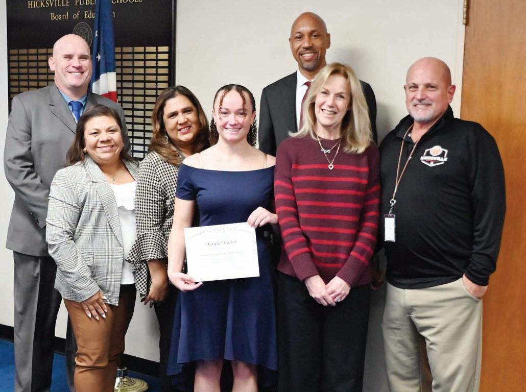 Front row (left to right): Hicksville Superintendent of Schools Dr. Ted Fulton, Hicksville Board of Education trustee Patricia Bulerin, Hicksville Board of Education trustee Sunita Manjrekar, student Kayla Kulier, Hicksville Swimming coach Sheri Epstein, Hicksville Athletic Director Matt Calarco. Back row: Hicksville High School Principal Ray Williams.