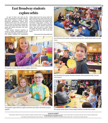 As part of their new unit on the moon, first-graders in Jennifer DeLuca and Karen Vaiano’s classes at East Broadway Elementary School built models of the moon, sun and earth on Feb. 27. Prior to the project, classes discussed facts that they knew about the moon and shared questions that they had about it. The project allowed students to receive a better understanding of the word orbit through a hands-on activity. The classes watched two educational