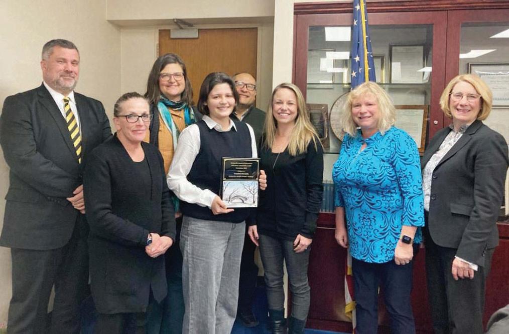 Members of the Hicksville Board of Education and administration congratulated eighth grader Annabel Miranda, the winner of the district’s annual holiday card contest, at the Dec. 14. board meeting.