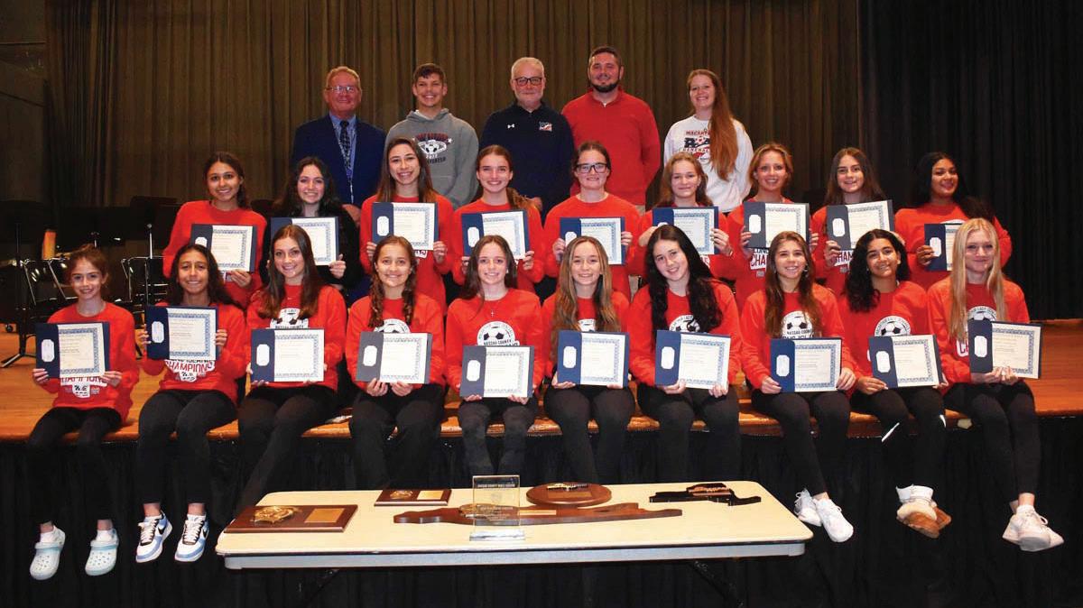 The board recognized the Long Island champion girls soccer team from MacArthur High School, which competed in the New York State semifinals. All players were introduced and individual accolades, such as All-County selections, were acknowledged.