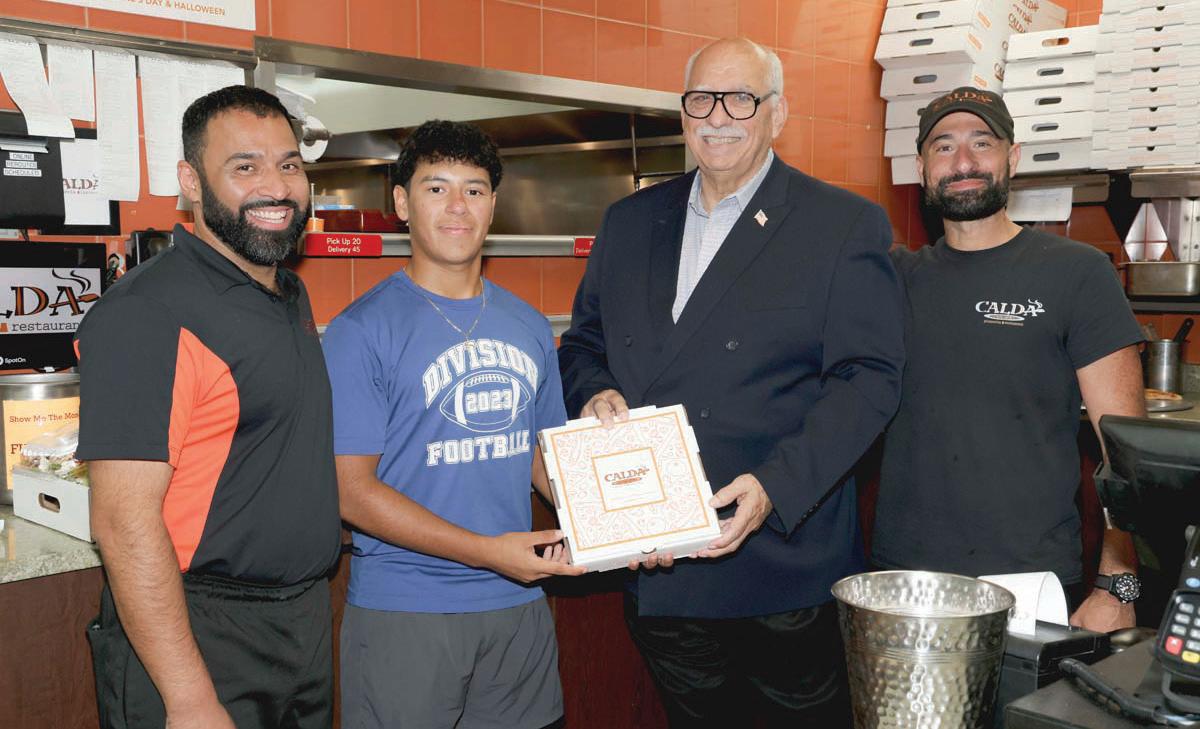 Hempstead Town Councilman Dennis Dunne (second right) attended the Calda Pizzeria fundraising event which helped raise money for the Division Avenue Quarterback Club. Twenty percent of all take-out orders that night were donated toward Division High School’s football program. Representing Division seniors was Julien Tomala of Levittown.