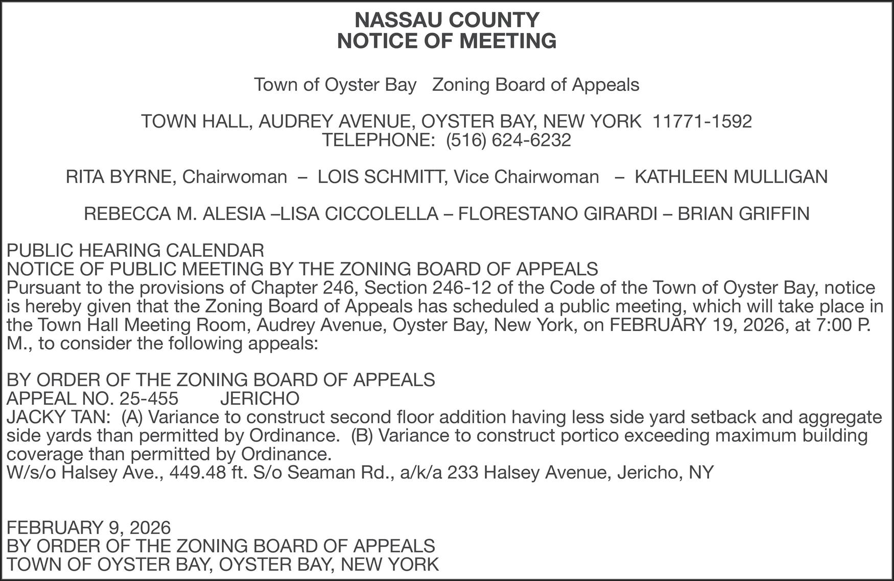 Pursuant to the provisions of Chapter 246, Section 246-12 of the Code of the Town of Oyster Bay, notice is hereby given that the Zoning Board of Appeals has scheduled a public meeting, which will take place in the Town Hall Meeting Room, Audrey Avenue, Oyster Bay, New York, on FEBRUARY 19, 2026, at 7:00 P. M., to consider the following appeals: