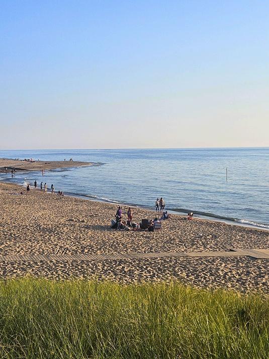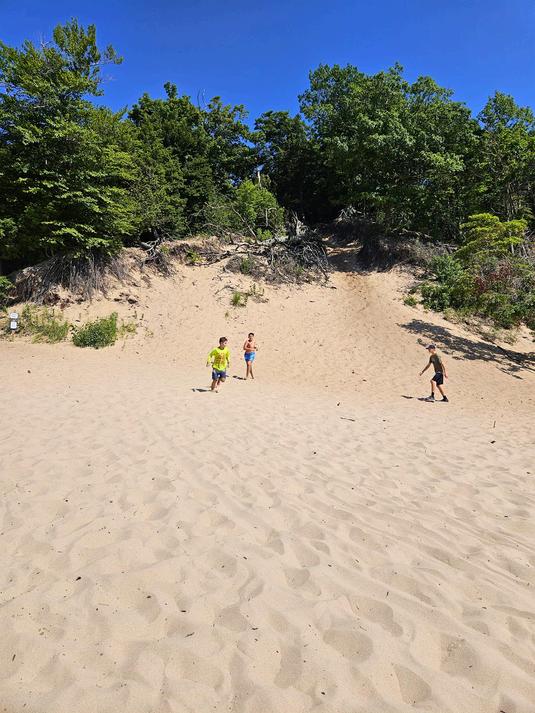 At Saugatuck Dunes State Park, you'll find a mix of forested trails and stunning Lake Michigan shoreline. The beach is about a ¾-mile walk from the parking lot perfect for a wagon ride through the woods Once you reach the beach, enjoy the soft sand and take on the dunes for some adventurous fun.