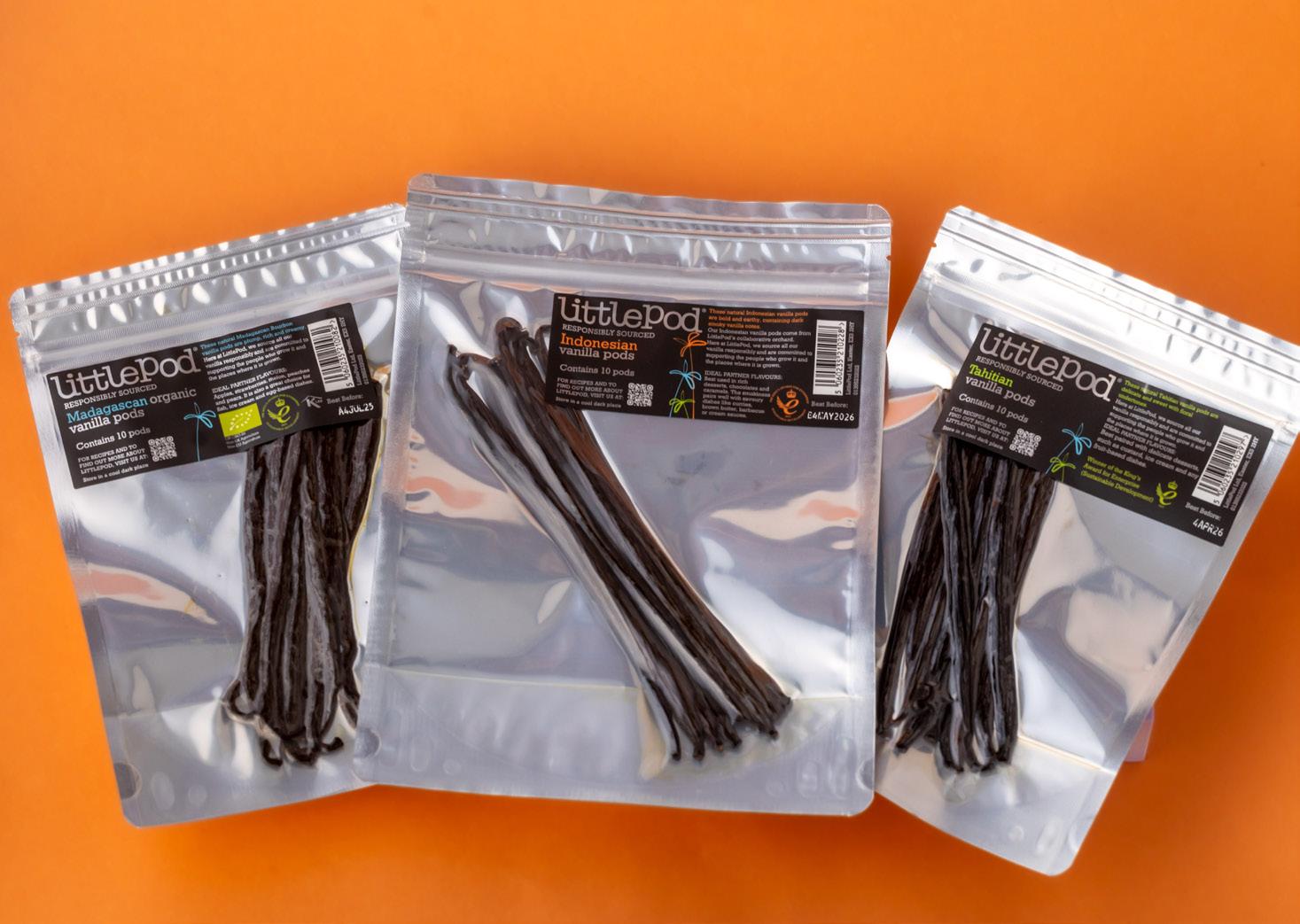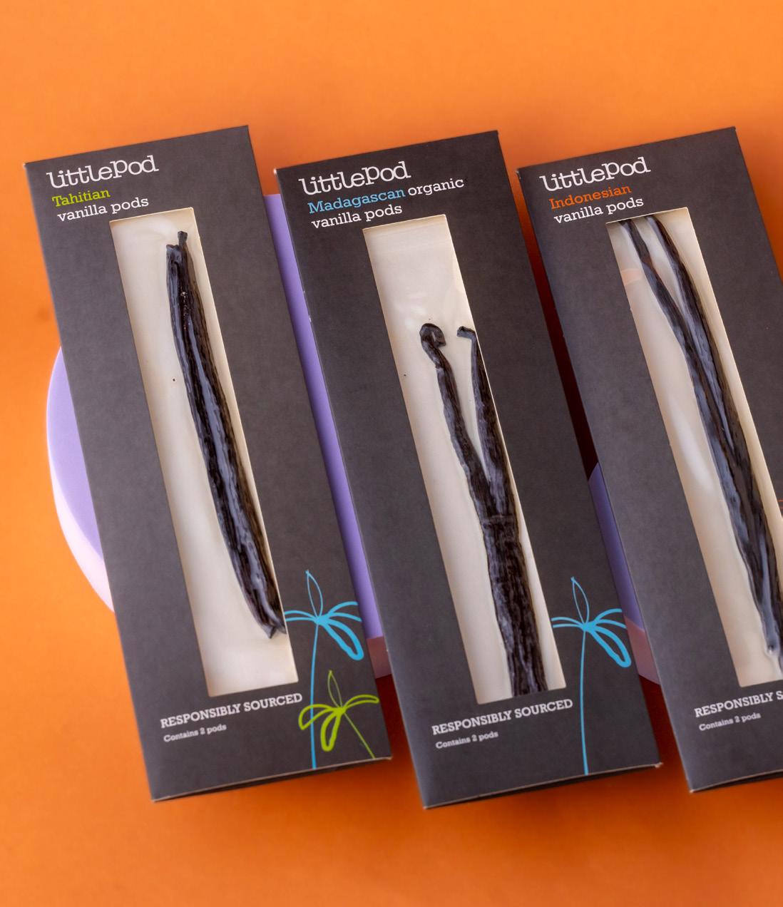 Madagascan organic, Tahitian and Indonesian vanilla pods (2s) These high-grade, natural vanilla pods are plump and moist. Our Indonesian vanilla pods come from the LittlePod orchard, where our farmers use a pioneering system of polyculture.