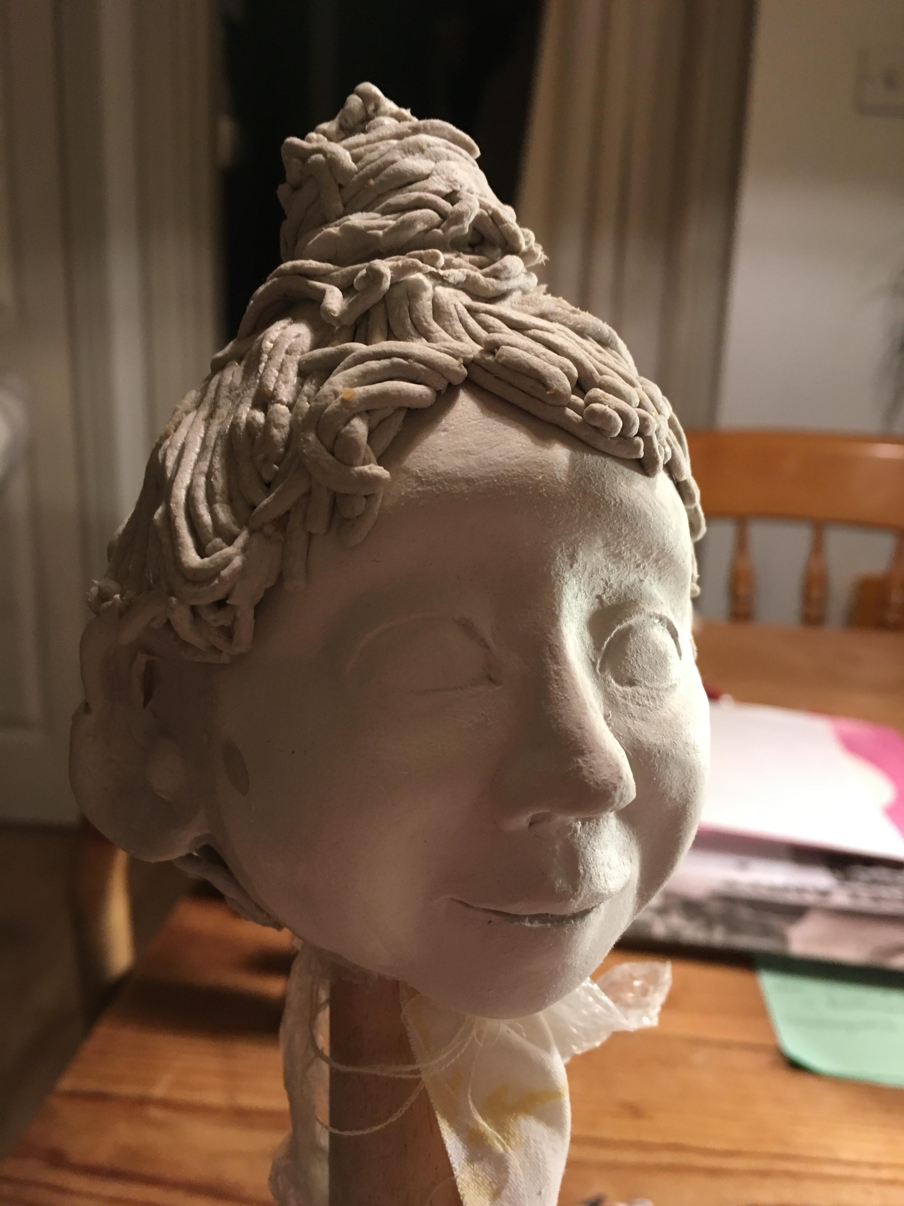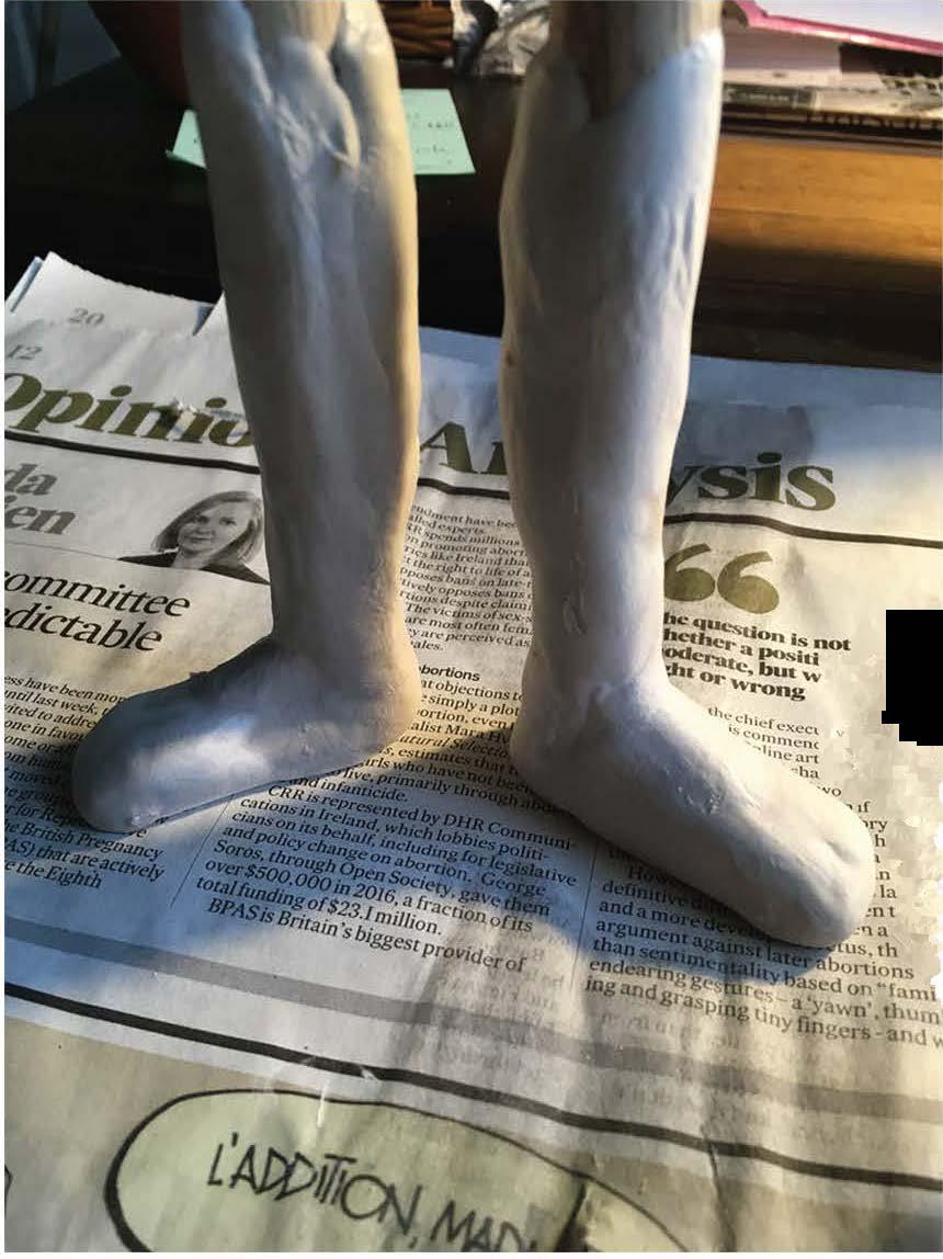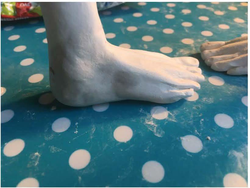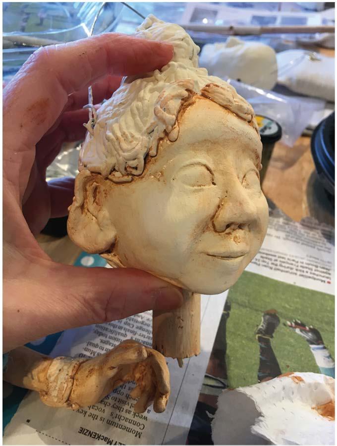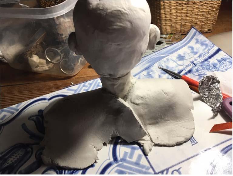 When you are finished working, and are happy with the results so far (we keep adding, and correcting detail- the head/hands/feet are made during several sessions so don’t despair!) place the sculpted part near a source of heat: a radiator, a stove. But not in an oven. Depending on the source of heat, and thickness of clay, the clay will dry in a few hours, or a day.