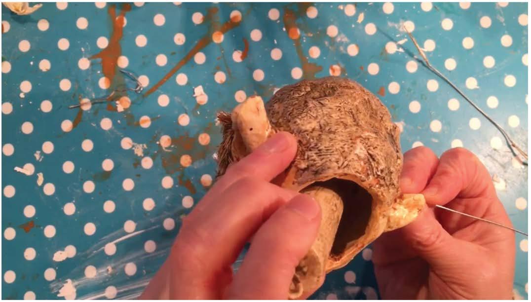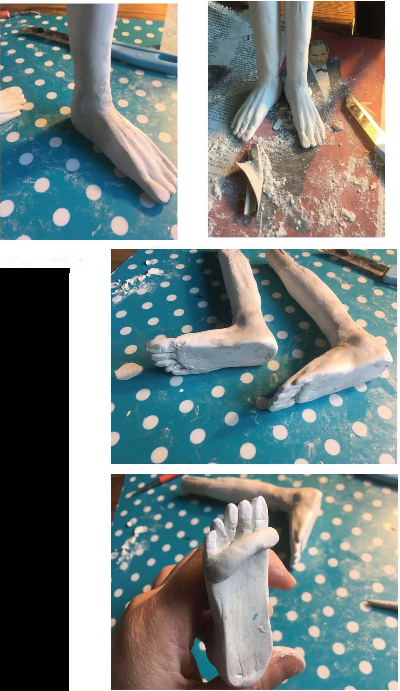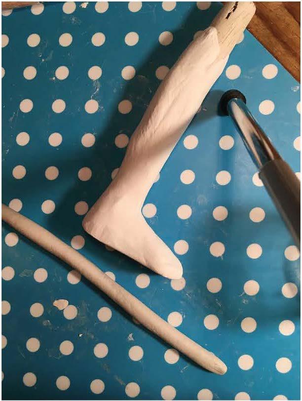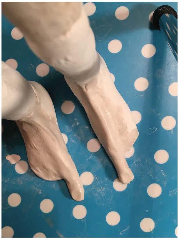 When you are finished working, and are happy with the results so far (we keep adding, and correcting detail- the head/hands/feet are made during several sessions so don’t despair!) place the sculpted part near a source of heat: a radiator, a stove. But not in an oven. Depending on the source of heat, and thickness of clay, the clay will dry in a few hours, or a day.