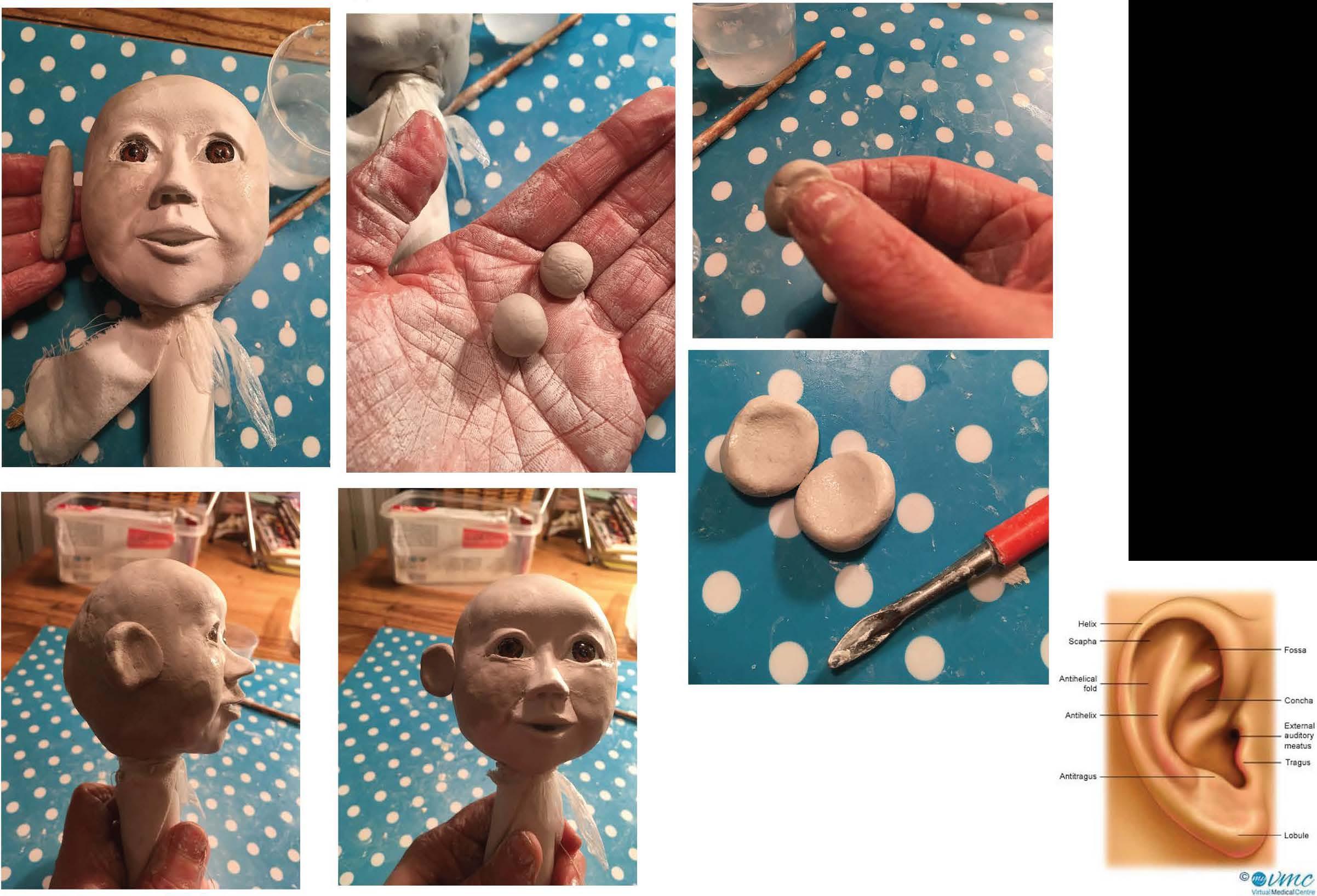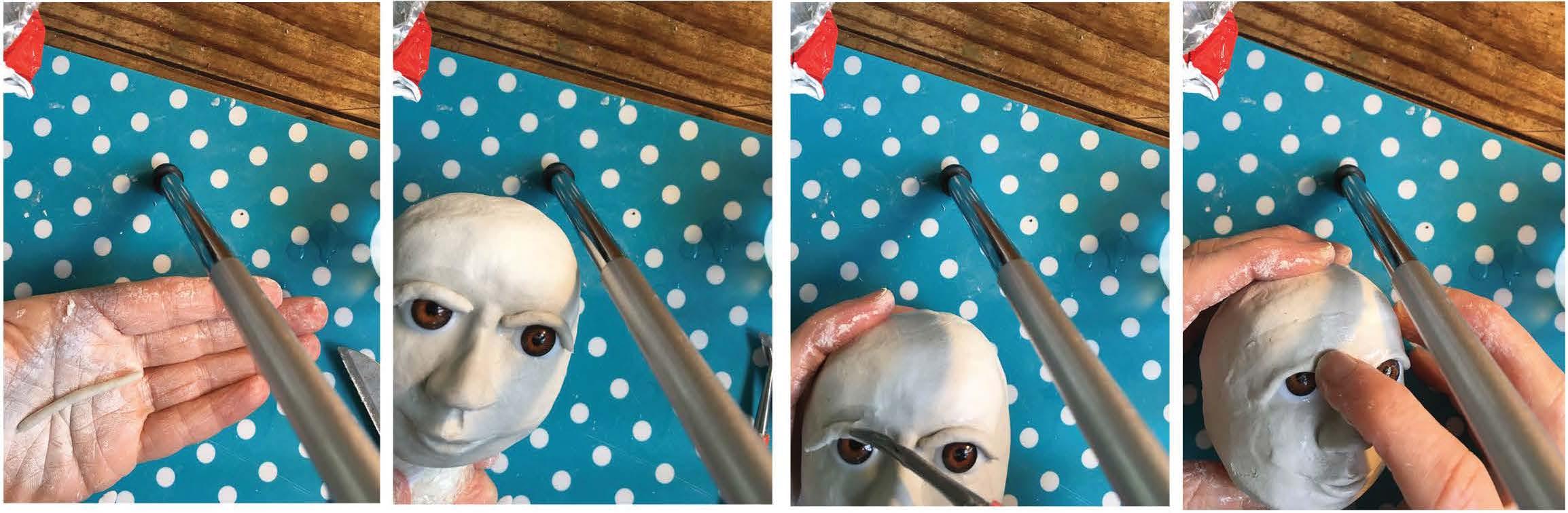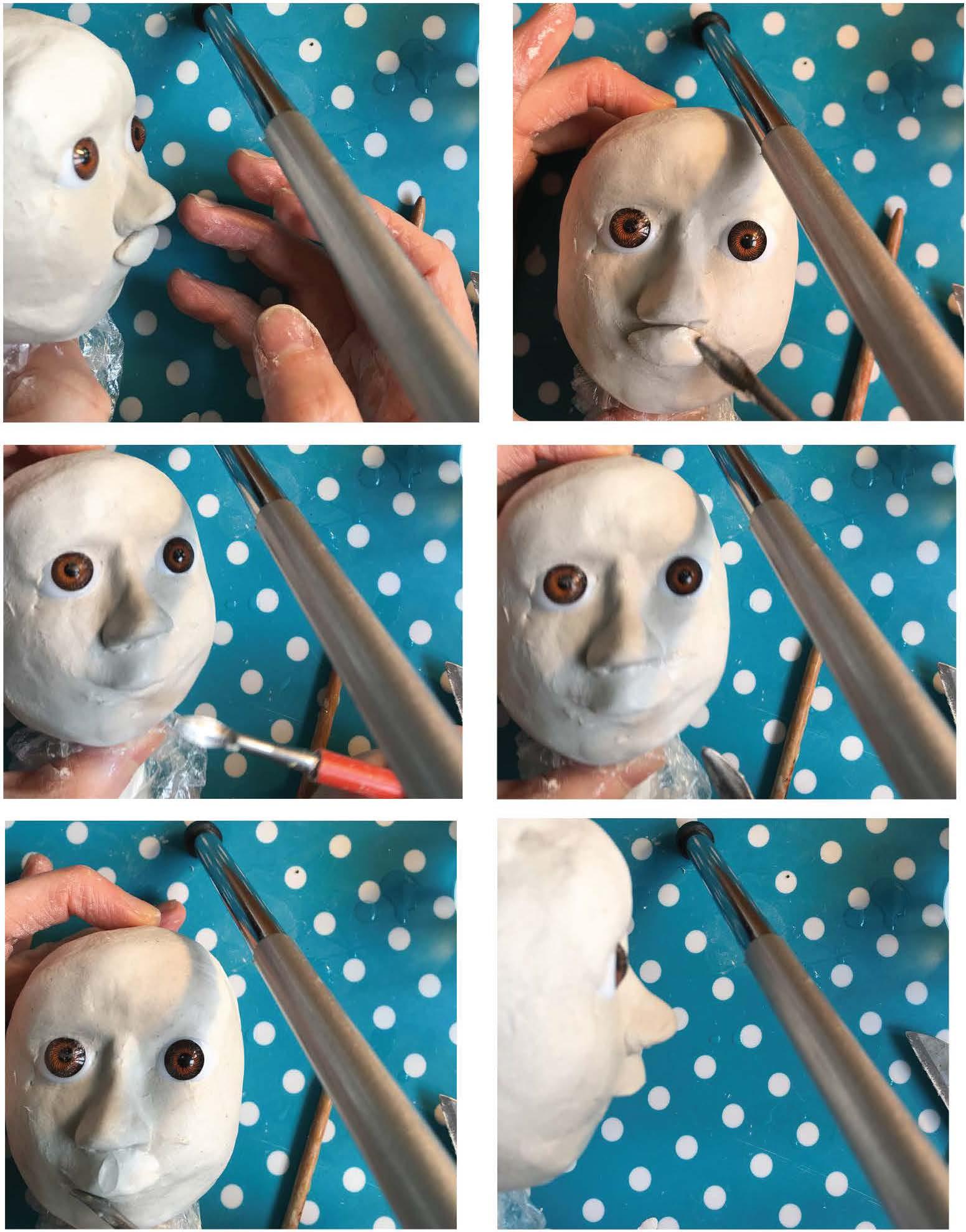My main tools really are my thumbs and index fingers I use both hands at the same time, for example around the shaping of the nose, to feel if both sides are equal in size and shape. See videos.