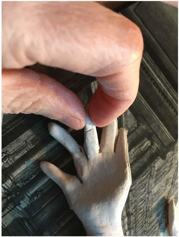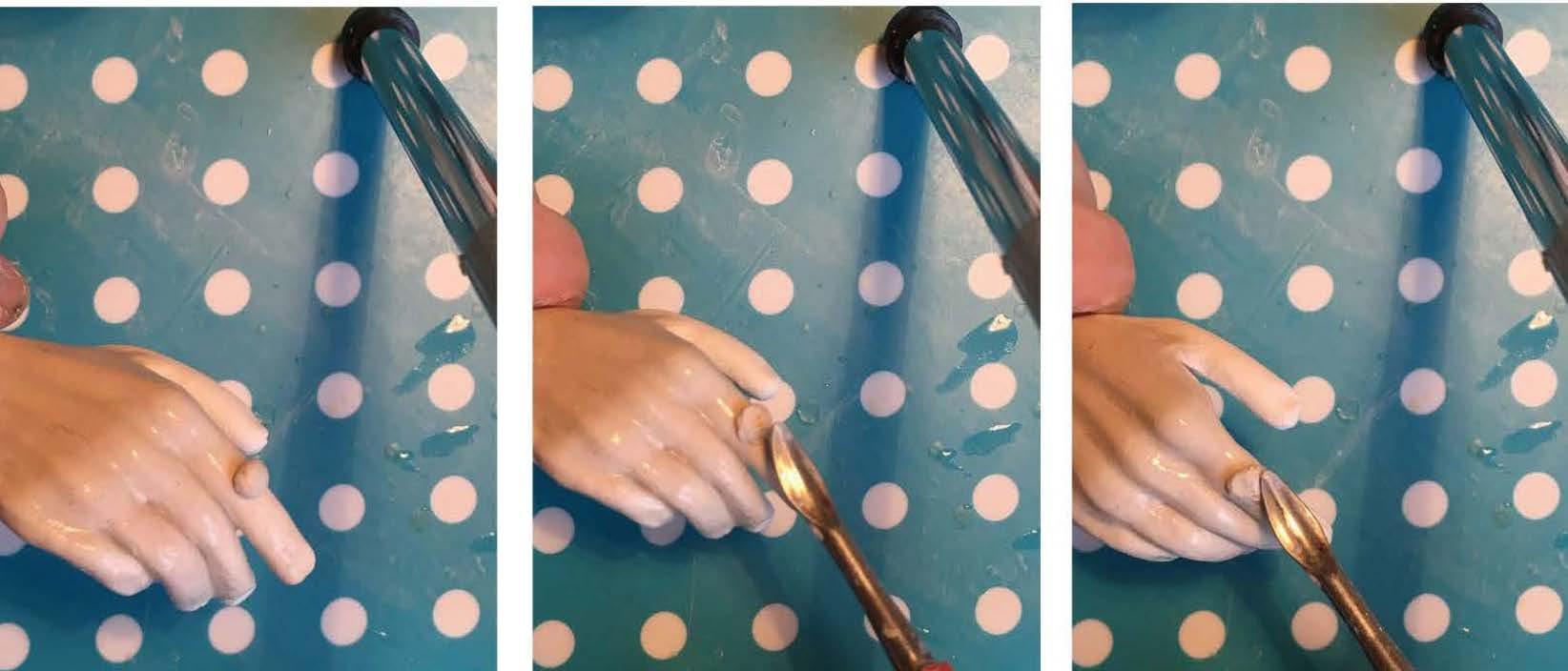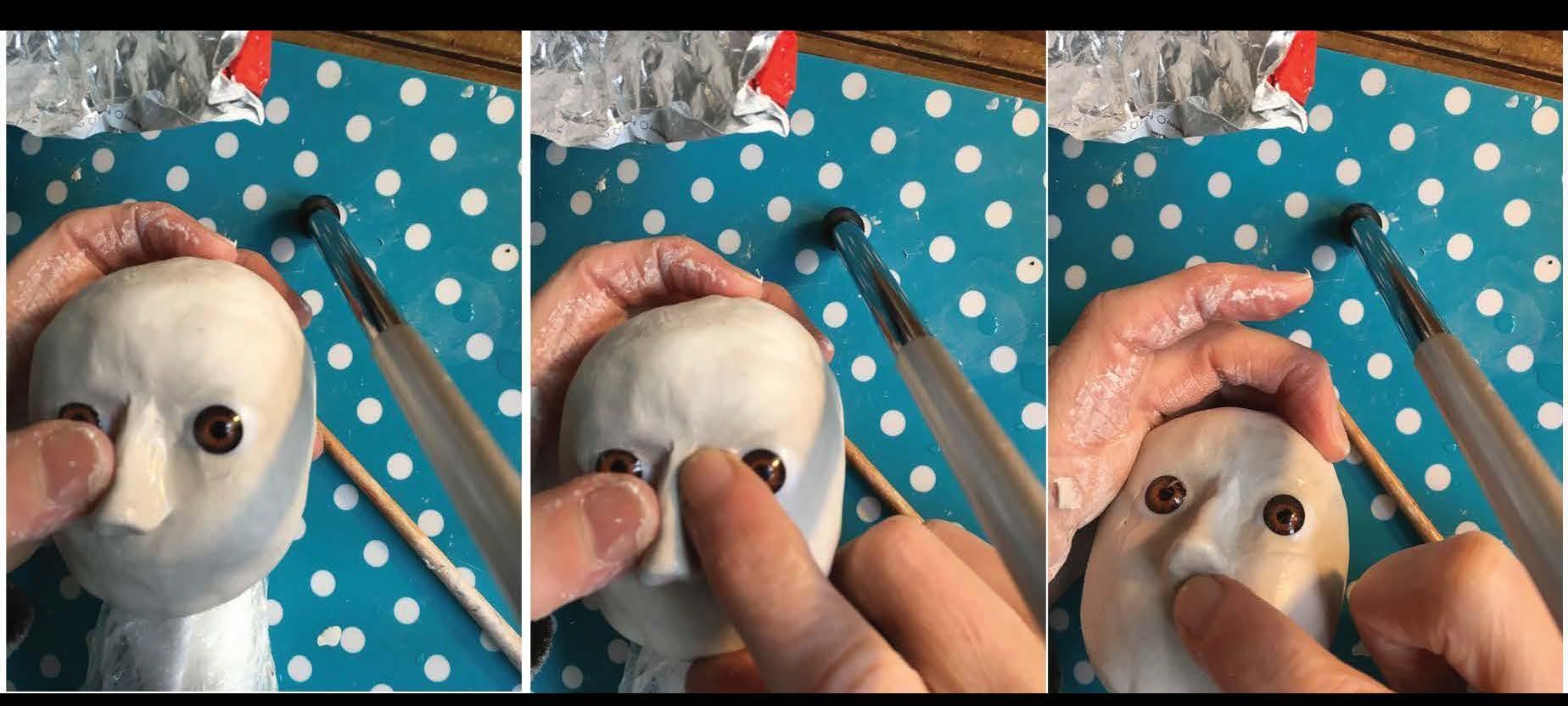 My main tools really are my thumbs and index fingers I use both hands at the same time, for example around the shaping of the nose, to feel if both sides are equal in size and shape. See videos.