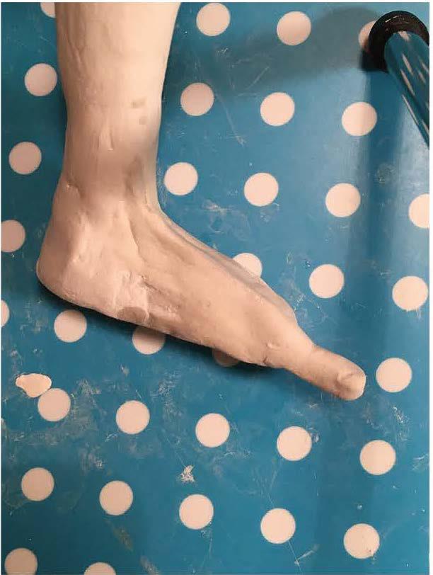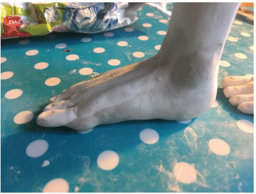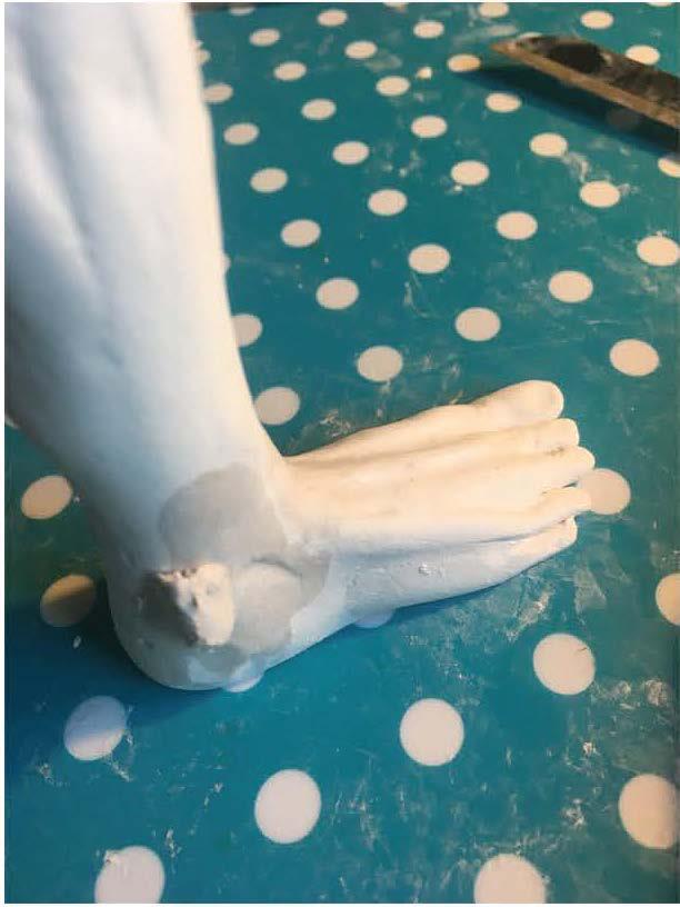 • Mix flesh acrylics with white gesso for the base colour of the head and hands, and bare feet.