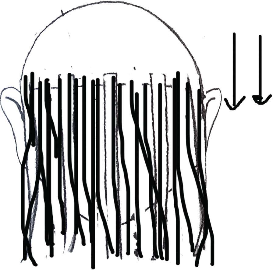 For long hair, which is tied up like in 'Birth Dance', (image on the left) glue long strips of mohair with either PVA or hot glue gun or super glue, hanging downwards over the face, and go all the way around the head. Then gather up the hair and tie it up.