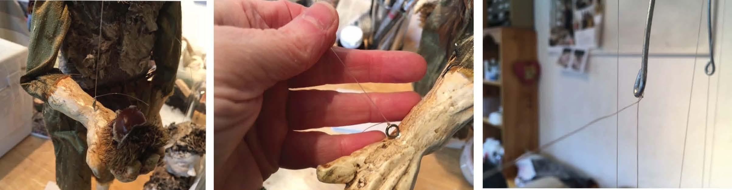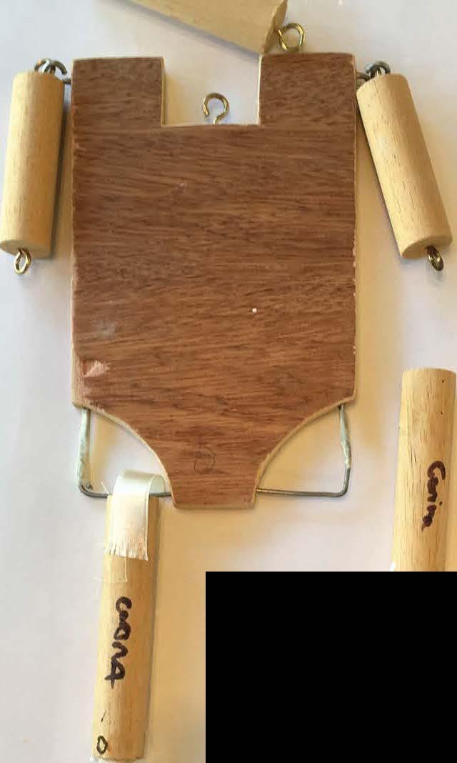 • Wooden puppet body: dowel, plywood, body stocking, stuffing, small screw eyes, small open hooks and wire.