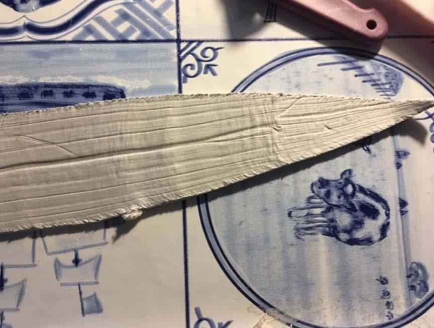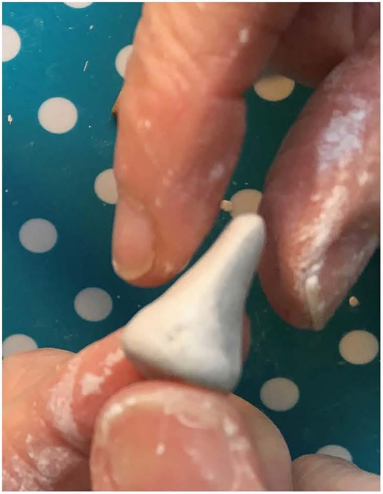 The Knife is a very sharp kitchen pairing knife with a smooth blade. So please be careful! I use the knife if there is any detail on the sculpted parts I don’t like, or are too much. For example, the head base is too big on the left, and I like the right side better- it is perfectly ok to cut off the part you don’t like. It is also useful to cut the leg dowel into shape.