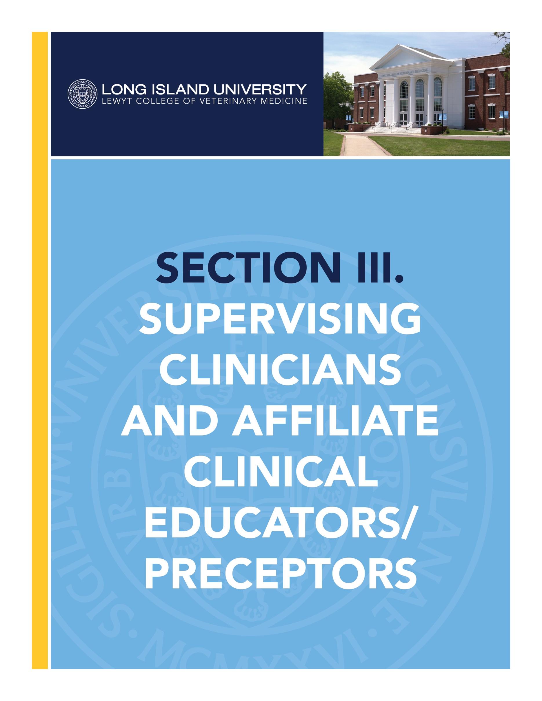 This handbook is intended to provide information to clinical affiliate clinicians and staff regarding the Long Island University Lewyt College of Veterinary Medicine (LIU-CVM). The content should provide an overview of the LIU-CVM curriculum, policies, expectations of students, and guidance for clinical affiliates working with the LIU-CVM curriculum.