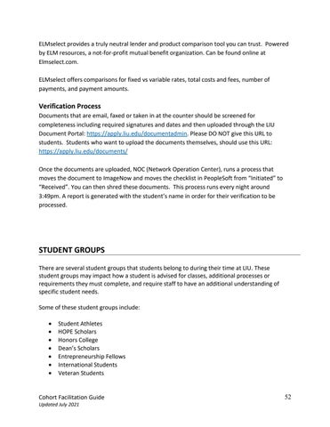 STUDENT GROUPS There are several student groups that students belong to during their time at LIU. These student groups may impact how a student is advised for classes, additional processes or requirements they must complete, and require staff to have an additional understanding of specific student needs. Some of these student groups include: • • • • • • •