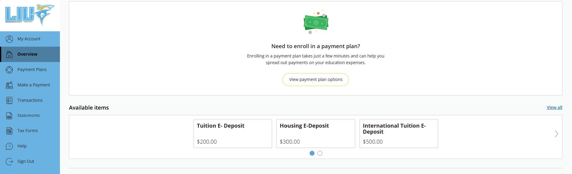 In a browser, navigate to my.liu.edu and click on the “Make a Payment” on bottom of the list to the right.