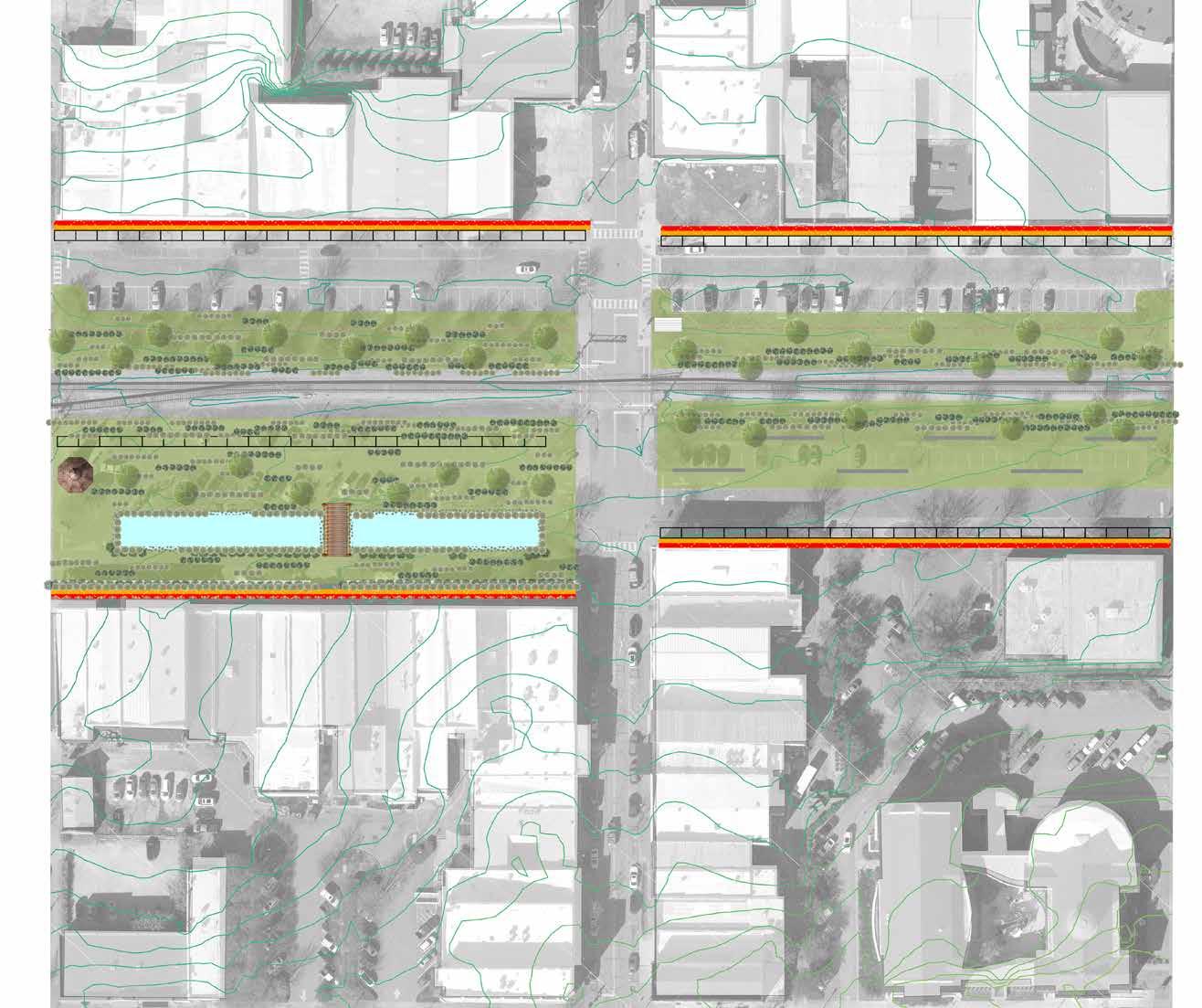 Between 10th and 9th street, I am adding a shrub screen along the train track, outdoor seating, and an outdoor deck for hangout.