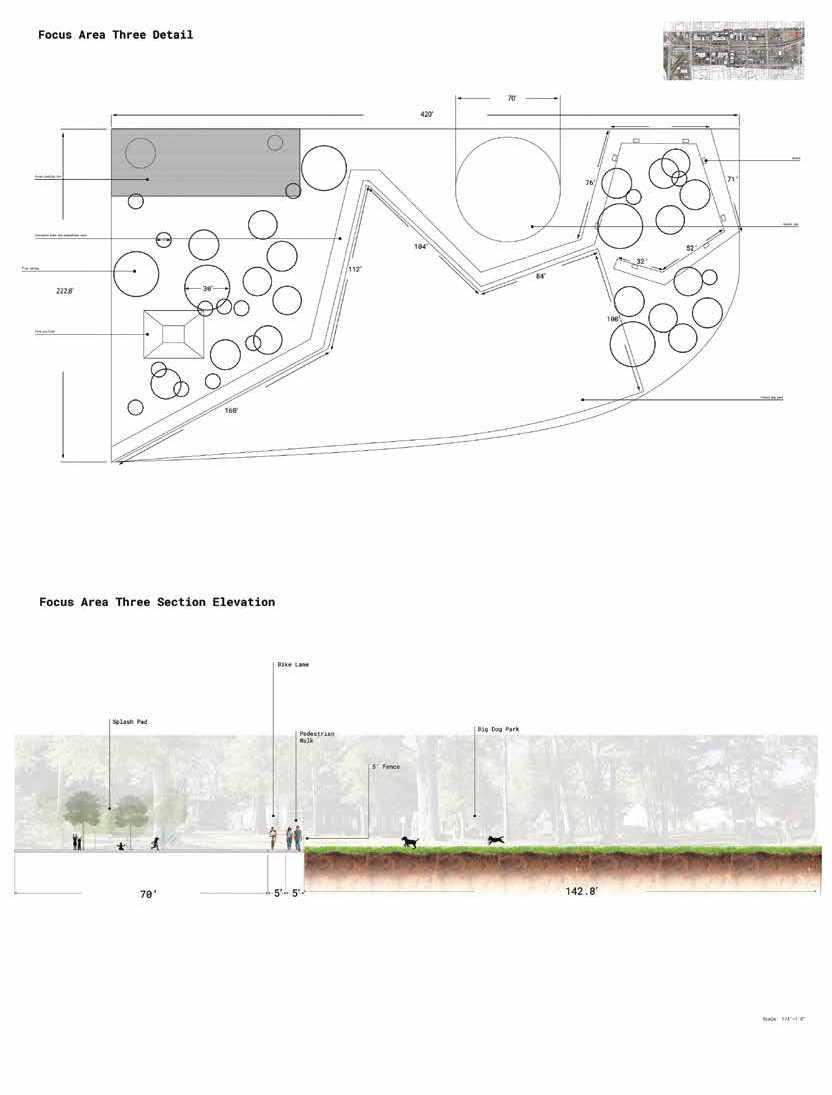 My green way section is going underneath interstate 85 and 65 in Montgomery. This area tends to be low-income, African American neighborhoods which are divided due to the construction of the interstates. Much African American business took away by the interstates. At the same time, the Selma to Montgomery historical trail goes right underneath the interstates. Residents think that a whole neighborhood is taken away by the interstate. Also, the most treasurable history is covered by the interstate as well. I focused on developing a green way that can reconnect the neighborhoods throughout the semester and bring the black business back. This green way is combined with a pedestrian line and bike line. I developed a sculpture Plaza, a vendor market, and local arts along the green way. I aimed to have local artists or residents come in to do the art on the green way and make it their green way.