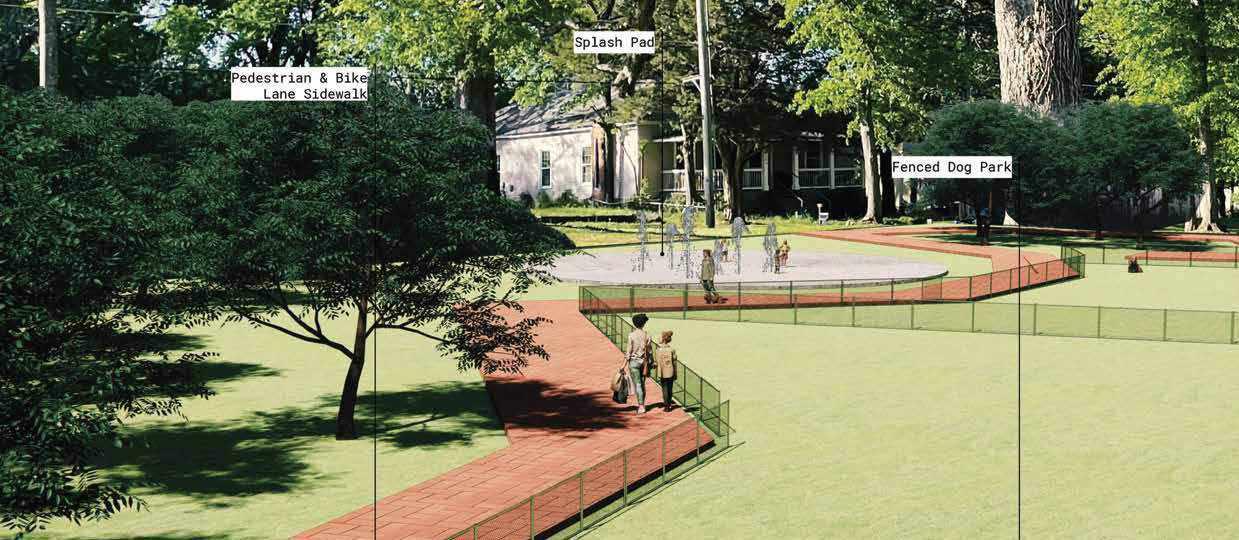 This focus area is between the old Depot office and 9th street. This design relocated the Museum of East Alabama to the warehouse. It turned the green space across the train track into an outdoor train history landscape display to view from the museum’s back window. Add an amphitheater next to the pre-K for outdoor class and their graduation. At the same time, add a playground in the area for children to play. Also, adding in shrub screening for safety and noise purposes.