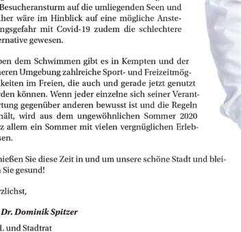 Ein besonderes Anliegen war es mir, dass das Stadtbad für die Kemptener Bürge rinnen und Bürger unter Einbeziehung eines Hygienekonzepts auch in diesem Jahr öffnet. Mein dazu gestellter Antrag an den Oberbürgermeister wurde von vielen befürwortet und schließlich angenommen. Die Möglichkeit, wenigs tens zeitlich begrenzt im Freibad schwimmen gehen zu können, ist ein wichtiges Stück Lebensqualität, das ich unseren Bürgerinnen und Bür gern nicht vorenthalten wollte. Ein nicht gelenkter Besucheransturm auf die umliegenden Seen und Weiher wäre im Hinblick auf eine mögliche Ansteckungsgefahr mit Covid-19 zudem die schlechtere Alternative gewesen.