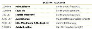 Es ist endlich so weit, nach zwei langen Jahren geht es wieder richtig los! Von Theateraufführungen über Kunstausstellungen bis hin zu etlichen Festivals und Konzertformaten, die aus dem Boden sprießen. Am 30. April beginnt der Jazzfrühling mit ca. 50 Konzerten unterschiedlichster Stilrichtungen. Ein Blick in dieses Heft reicht aus, um zu sehen, was alles wieder ge boten ist.