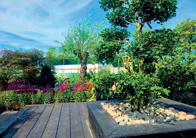 garden boasting a myriad of horticultural wonders from large specimen trees, beautiful perennials, delightful shrubs and elegant garden stoneware. Proving popular with visitors of all ages, this delightful show garden welcomed visitors with a winding journey along a stunning Indian sandstone block-paving pathway, leading from the show garden’s entrance beneath three Jasmine arches to arrive at a purpose-built Millboard decking area. With inbuilt seating and surrounded on all sides with colourfully fragrant planted beds, many visitors spent time relaxing and unwinding in a garden of solitude from the shows otherwise busy areas.