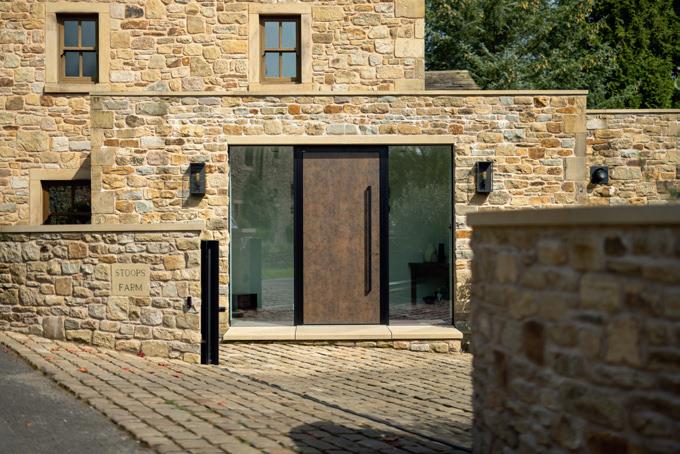 framework is concealed within the stonework –and the space also includes a long slot rooflight, creating additional natural light to the centre. Oversized floor tiles continue through to the external terrace, blending indoor and outdoor living, and the corner window directs the outward views to the bottom of the garden and fields beyond.