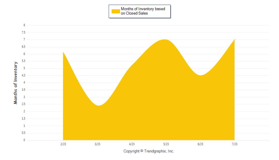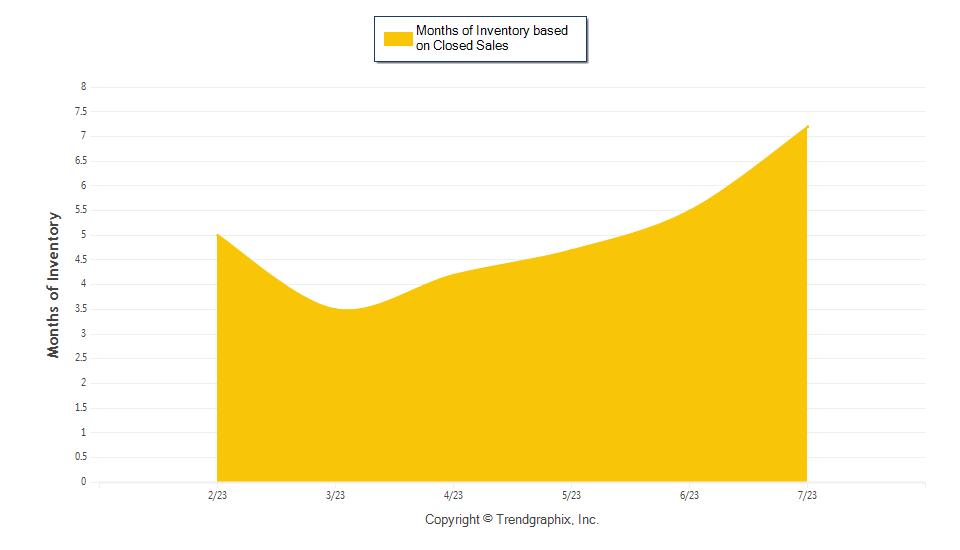 The July 2023 Months of Inventory based on Closed Sales of 7.3 was up 30.4% compared to last month. July 2023 was Buyer's market.